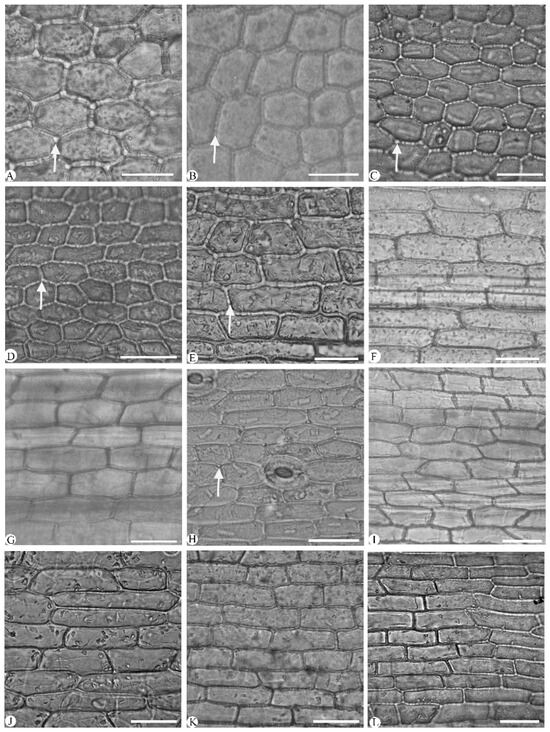 Adaxial leaf epidermis of twelve Cymbidium species under light microscope, with epidermal cells and stigmata present (arrow). (A–I) Polygonal epidermal cells; (J–L) rectangular epidermal cells. (A) C. lancifolium; (B) C. floribundum; (C) C. wenshanense; (D) C. tracyanum; (E) C. faberi; (F) C. eburneum; (G) C. qiubeiense; (H) C. mastersii; (I) C. kanran; (J) C. hookerianum; (K) C. defoliatum; (L) C. serratum. Scale bars = 50 µm.
