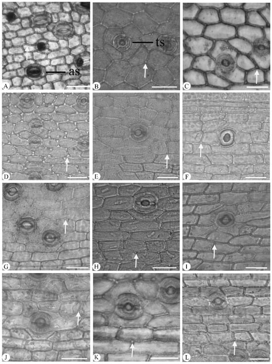 Abaxial leaf epidermis of twelve Cymbidium species under light microscope, with epidermal cells, stigmata (arrow), and stomatal shape clearly observable. (A–D) Broad polygonal epidermal cells; (E–L) narrow polygonal epidermal cells. (A) C. floribundum; (B) C. lancifolium; (C) C. eburneum; (D) C. wenshanense; (E) C. kanran; (F) C. faberi; (G) C. defoliatum; (H) C. mastersii; (I) C. serratum; (J) C. qiubeiense; (K) C. hookerianum; (L) C. tracyanum. as, anomocytic stomata; ts, tetracytic stomata. Scale bars = 50 μm.