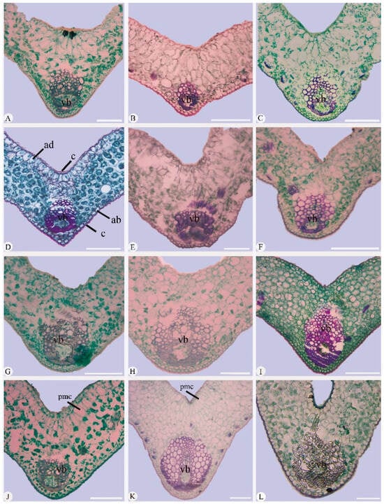 Two types of midrib cross-sections seen in twelve Cymbidium species. (A–E) Shallow V-shape leaf midrib outline; (F–L) V-shape leaf midrib outline. (A) C. tracyanum; (B) C. mastersii; (C) C. wenshanense; (D) C. serratum; (E) C. eburneum; (F) C. kanran; (G) C. hookerianum; (H) C. floribundum; (I) C. faberi; (J) C. lancifolium; (K) C. qiubeiense; (L) C. defoliatum. ad, adaxial surface; ab, abaxial surface; c, cuticle; vb, vascular bundles; pmc, palisade mesophyll cells. Scale bars = 200 μm.