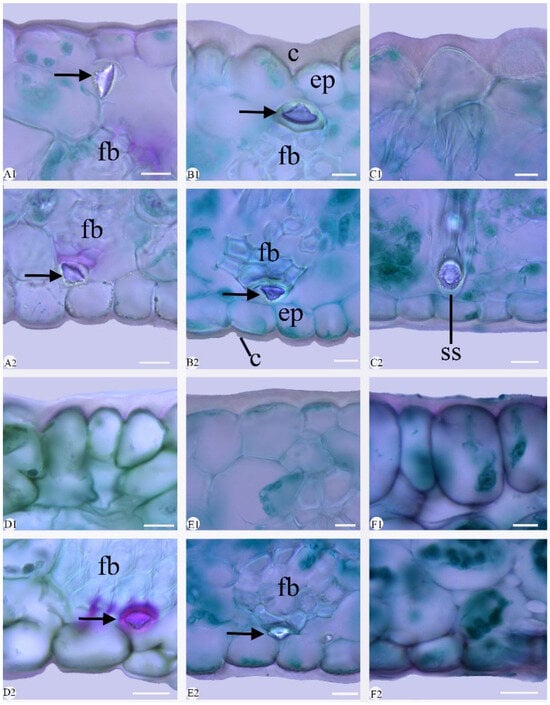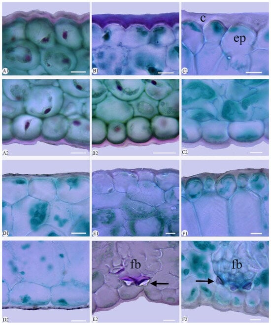 Micro-morphology of cuticle, epidermis, fiber bundle, and stegmata, seen in cross-sections of six Cymbidium species. 1, adaxial surface; 2, abaxial surface. (A1,A2) C. kanran; (B1,B2) C. defoliatum; (C1,C2) C. floribundum; (D1,D2) C. lancifolium; (E1,E2) C. faberi; (F1,F2) C. qiubeiense. Conical of stegmata = arrow; c, cuticle; ep, epidermis cell; fb, fiber bundles. Scale bars = 10 μm.
