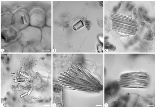 Three types of crystal seen in six Cymbidium species. (A,B) Terete crystal in (A) C. faberi and (B) C. tracyanum; (C–E) long tube crystal bundles in (C) C. qiubeiense, (D) C. kanran, and (E) C. mastersii; and (F) raphide crystals in C. lancifolium. Scale bars = 10 μm.