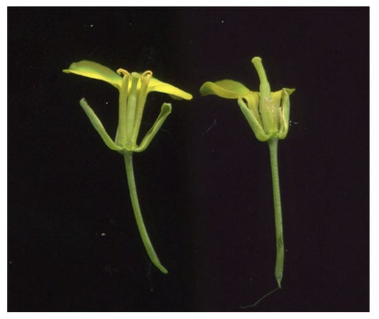The flower phenotype of ZY50 (left) and S201 mutant (right). A portion of the corolla of each flower was removed to show the stamen morphology more clearly.