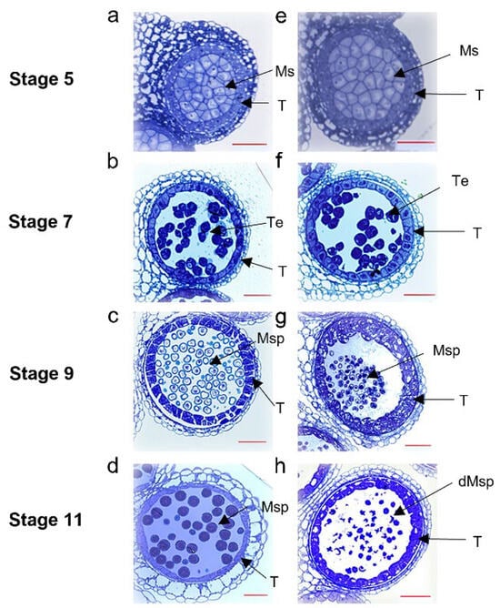 Semi-thin section analysis was performed to examine morphological variations in anther development between S201 and ZY50. At stage 5 of anther development, there were no notable morphological differences between S201 and ZY50 (Figure 2a,e). However, at stage 7, the microspores in S201 appeared less regular, and more circular than those in ZY50 (Figure 2b,f). At stage 9, S201 showed an abnormally hypertrophic and vacuolated tapetum compared with that of ZY50 (Figure 2c,g). The microspores in S201 exhibited morphological abnormalities compared to those in ZY50 (Figure 2c,g). At stage 11, mature microspores were observed in ZY50, whereas the microspores in S201 had almost completely degenerated and collapsed (Figure 2d,h). Additionally, the tapetum in S201 remained in a hypertrophic and vacuolated state (Figure 2d,h).
