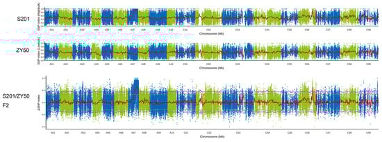 Manhattan plot of the distribution of SNP-index on chromosome in S201 and ZY50, and ΔSNP-index on chromosome in S201/ZY50 F2. The green dots and blue dots represent the values of SNP-index or of ΔSNP-index, respectively. The red line is the fit line of the SNP-index or ΔSNP-index by sliding-window analysis. The orange yellow line represents the 95% confidence interval upper side; the purple line represents the 99% confidence interval upper side.