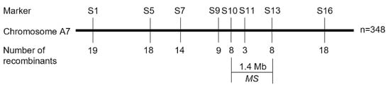 Map location of MS gene on rapeseed chromosome A7 in 348 F2 plants in which a region (1.4 Mb) is segregating. The thick bar represents the genomic region; the numbers underneath the bars indicate the number of recombinants between MS and the molecular marker.