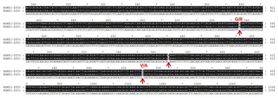 Three SNPs at positions 535 (A535G), 768 (G768A) and 890 (C890T) from the translation start site were identified in the coding region of BnCYP704B1 in S201 (Figure 6). Of these, the SNP at position 768 was a synonymous mutation that did not alter the amino acid. The two SNPs at position 535 and 890 in BnCYP704B1 gene of S201 resulted in amino acid substitutions of G179R and V297A between ZY50 and S201 (Figure 6). Notably, the V297A substitution was reported to mutate the BnCYP704B1 protein, resulting in male sterility in Brassica napus []. These findings suggest that the MS gene encodes the BnCYP704B1 protein, which is responsible for the male sterility phenotype in the S201 mutant.