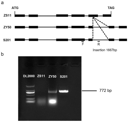 A previous study reported that homologous genes of BnCYP704B1 on A7 and C6 redundantly control male sterility in Brassica napus []. However, our results show that the male sterility phenotype of S201 is controlled by a single recessive gene. To explore this further, the BnCYP704B1 homologous gene on C6, previously named BnMS2 [], was cloned and analyzed between ZY50 and S201. A comparison with the rapeseed reference genome (ZS11) showed that both S201 and ZY50 contained a 1667bp insertion in the fifth exon of the MS homolog (Figure S2). To further identify the fragment insertion in the MS homolog between ZY50 and S201, primers were specially designed, in which the forward primer was located in the fourth exon upstream of the insertion fragment and the reverse primer was located in the insertion fragment (Figure 7a). The RT-PCR results showed that the expected fragment, 772bp, could be amplified from S201 and ZY50, but not from the control cultivar, ZS11 (Figure 7b). A previous study showed that the fragment insertion in the fifth exon of the homolog resulted in the frameshift mutation, ultimately causing the protein to lose its function []. Our findings suggest that the MS homolog on C6 in both S201 and ZY50 was naturally mutated due to the fragment insertion in the fifth exon.
