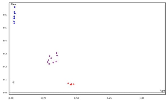 Kompetitive allele-specific PCR (KASPar) genotyping in a segregating rapeseed BC1F2 population for the selection of fertile-sterile lines. KASPar genotyping of MS gene on BC1F2 lines using functional marker S10. The blue, red, purple and black dots represent homozygous alleles (A/A; ZY50 genotype), homozygous alleles (G/G; S201 genotype), heterozygous alleles (A/G) and non-template control, respectively.