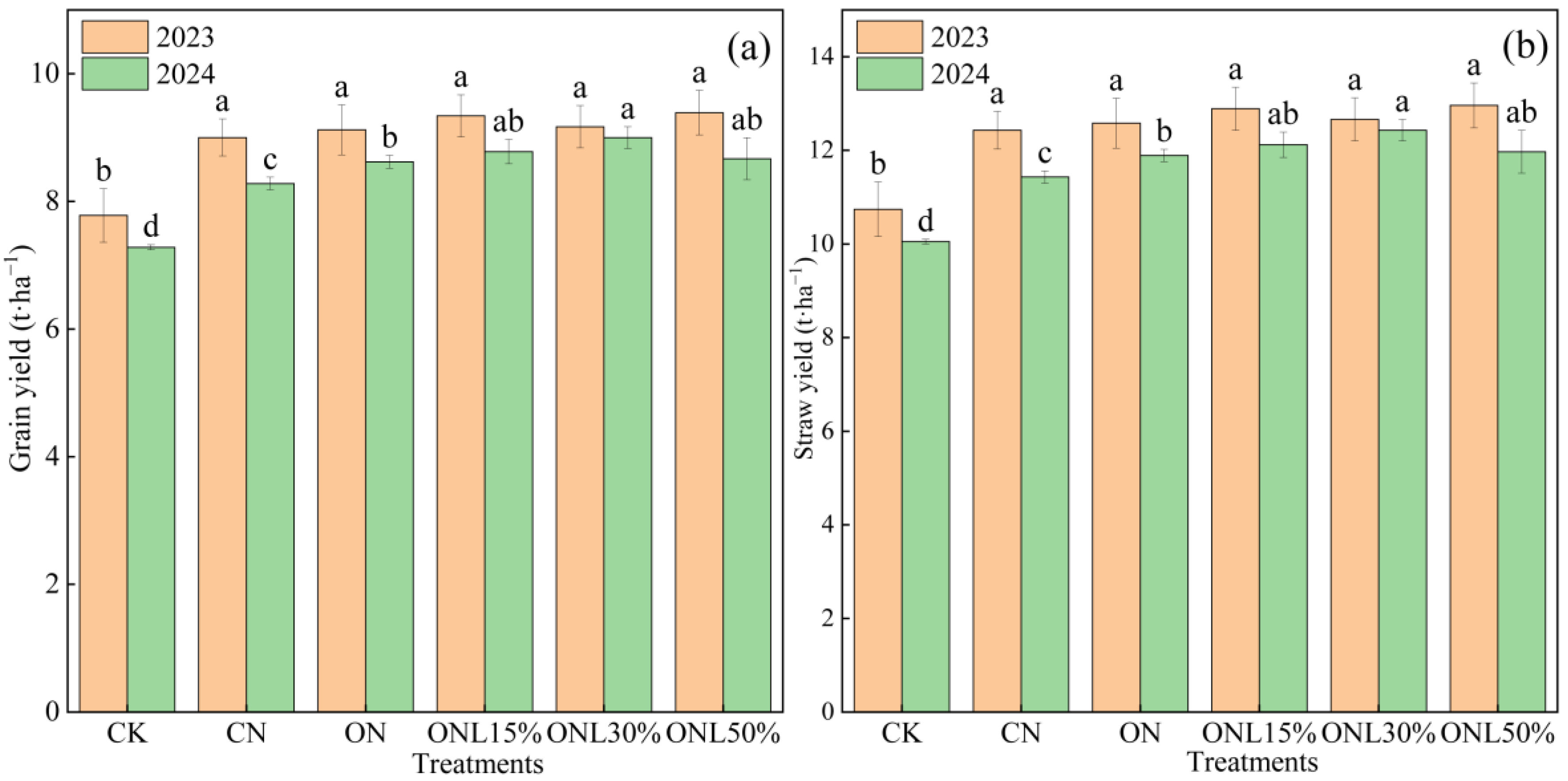 | 2023 | CK | 71.21 ± 3.34 b | 39.44 ± 0.82 b | 36.33 ± 2.65 c |