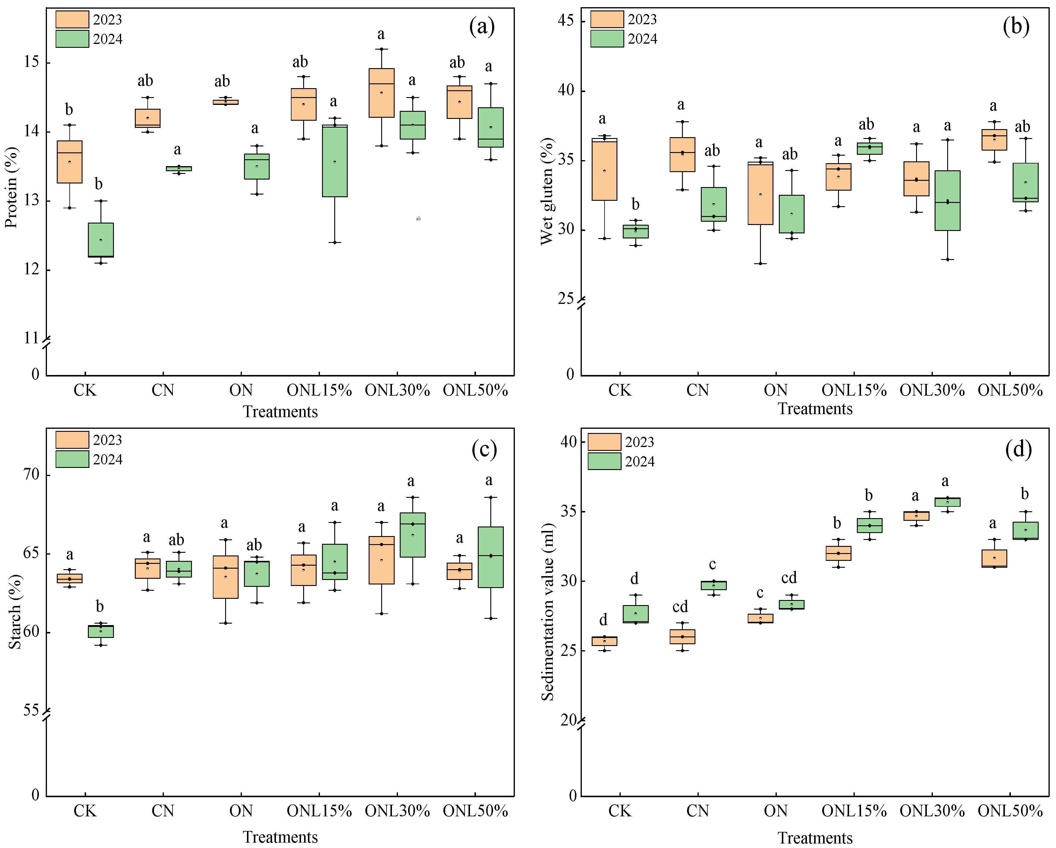 3.1. Effect of Substituting Chemical Nitrogen Fertilizer with Biogas Slurry on Wheat Yield, Quality, and Cumulative Nitrogen Use Efficiency