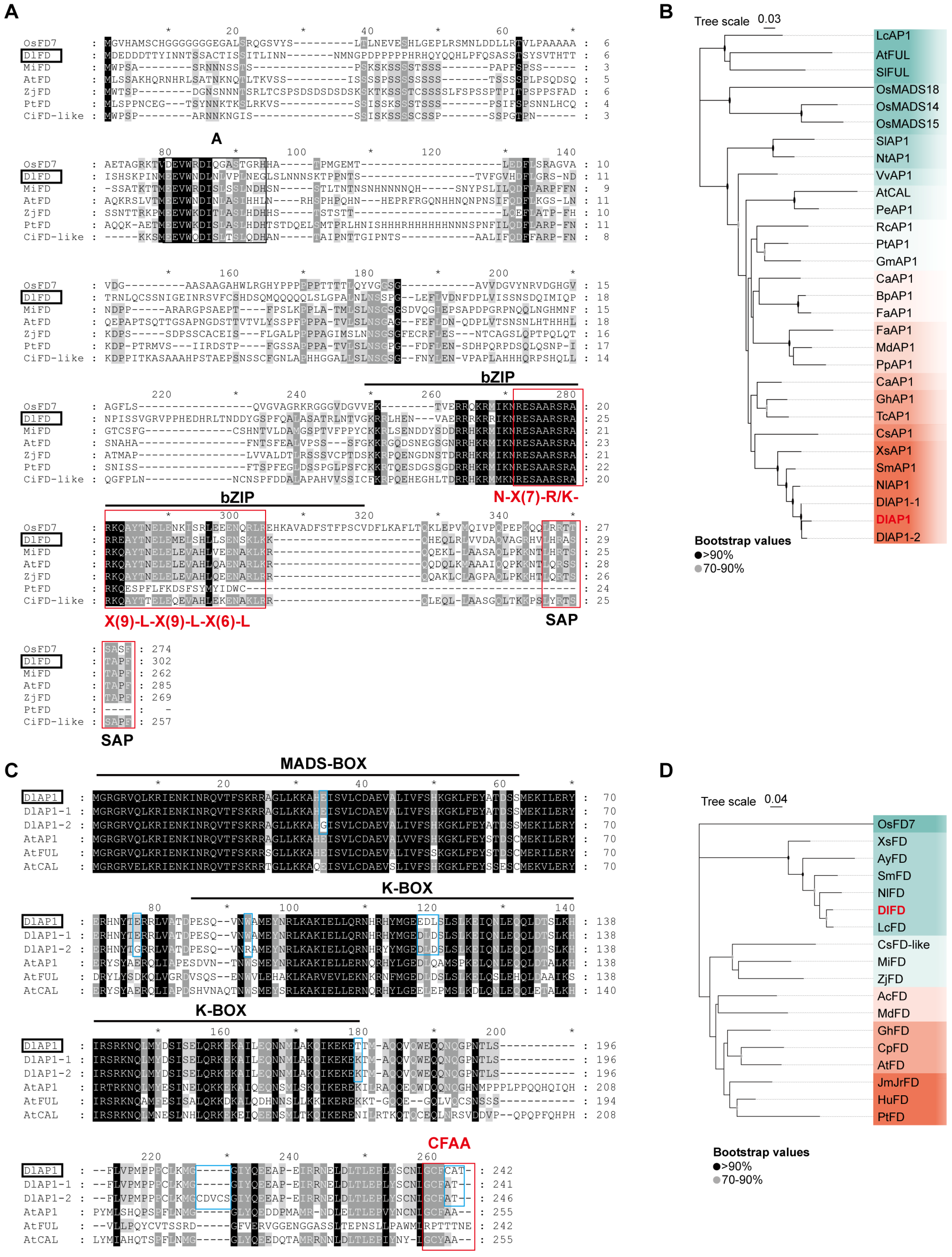 2.1. Sequence Comparison and Phylogenetic Analysis of DlAP1 and DlFD