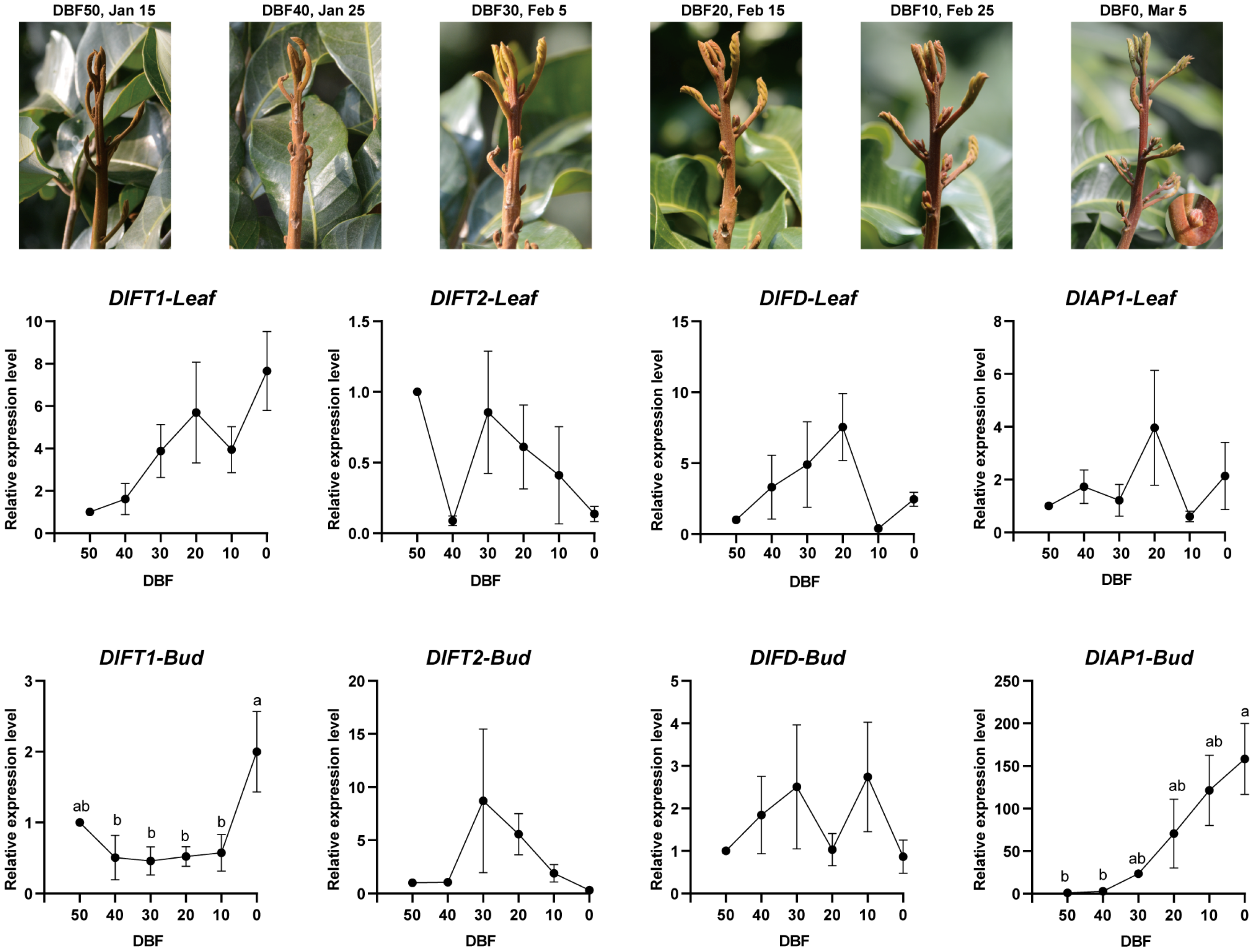 2.2. Expression Pattern of DlAP1, DlFD and DlFT1/2 in Longan Flowering