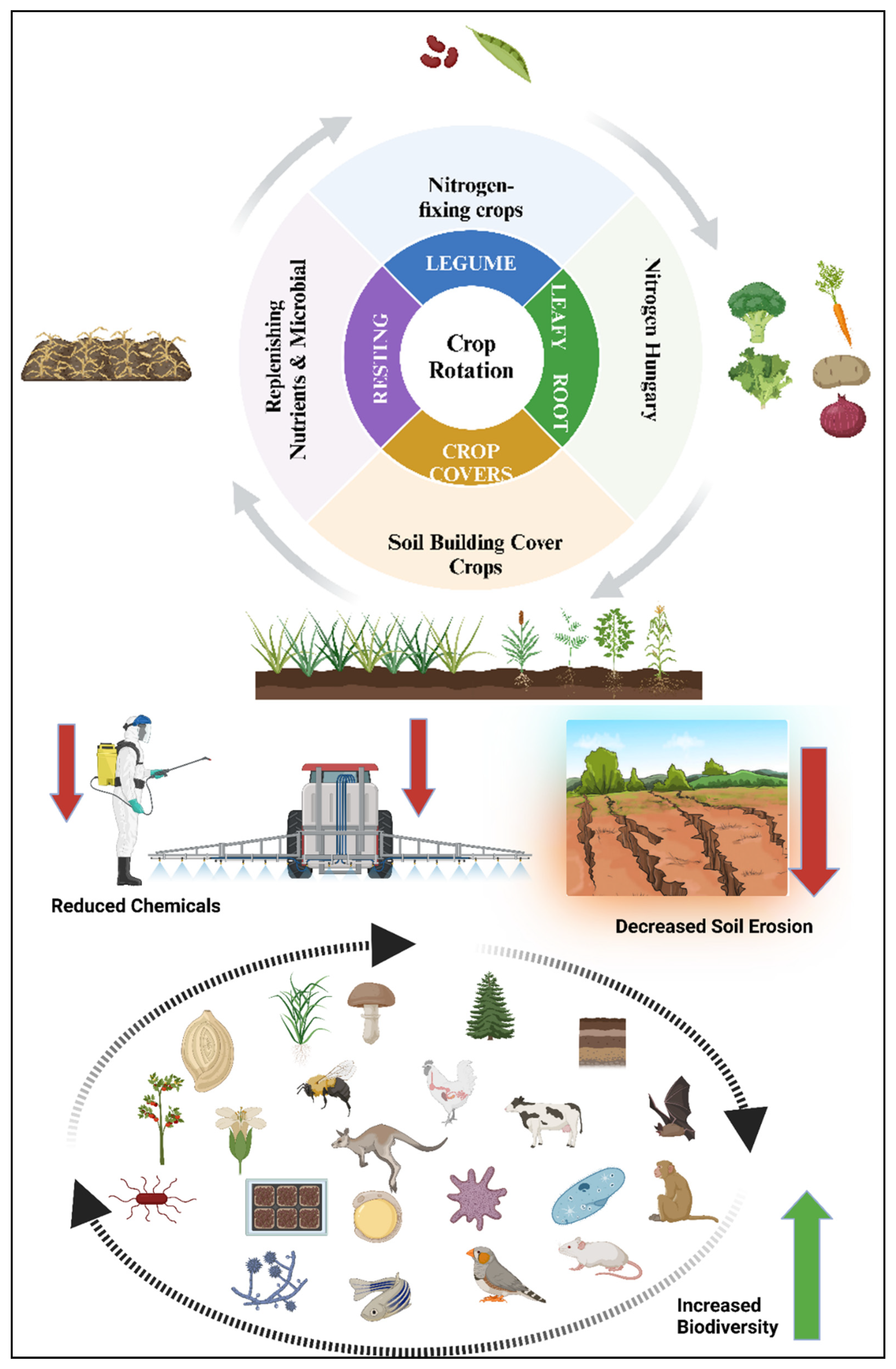 | Polyculture | Growing multiple crop species together. | Reduces pest outbreaks by 30–60% compared to monocultures [154]. | Intercropping maize with beans or squash. |