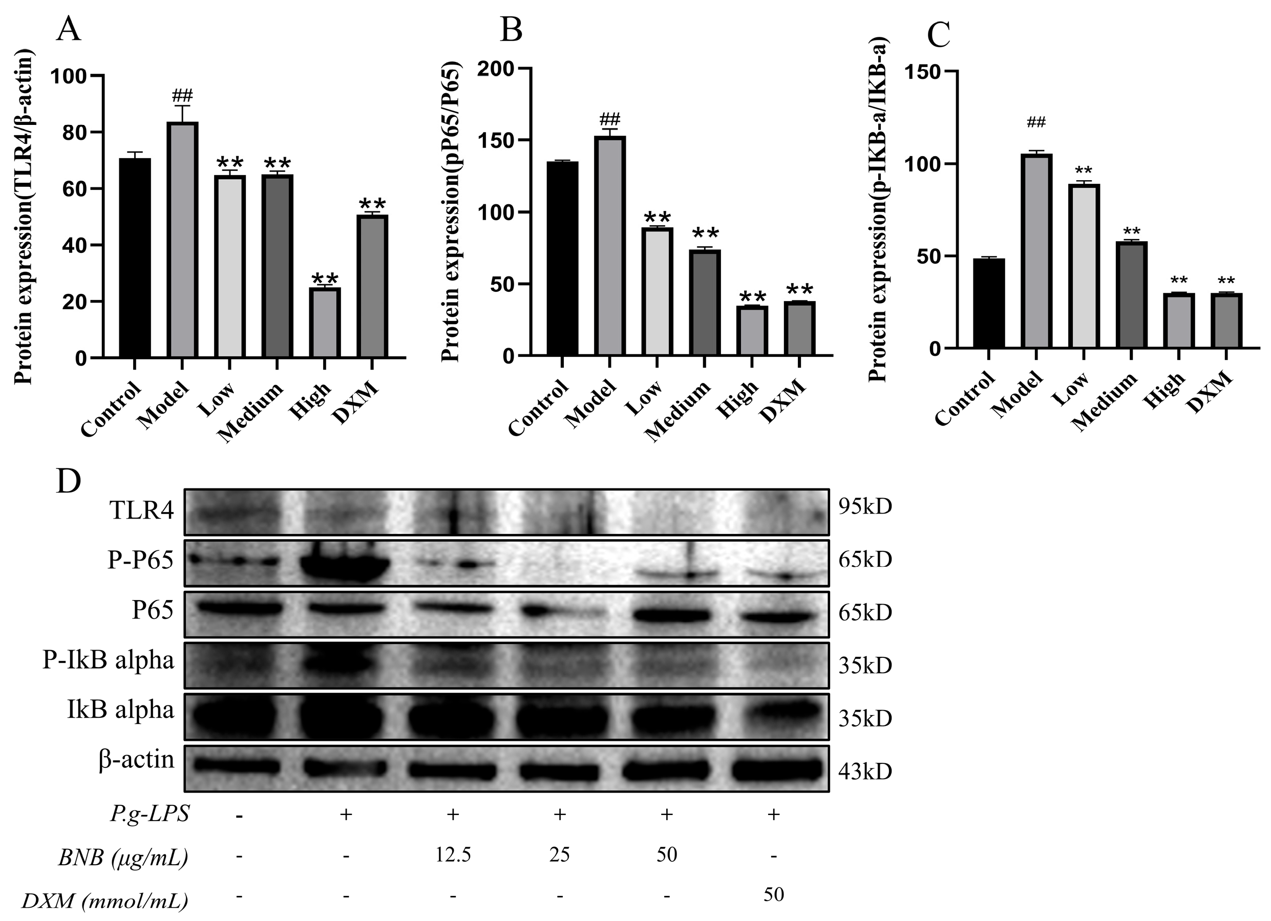 3.8. Effect of BNB on the Expression of NF-κB Pathway-Related Proteins in LPS-Induced RAW264.7 Cells