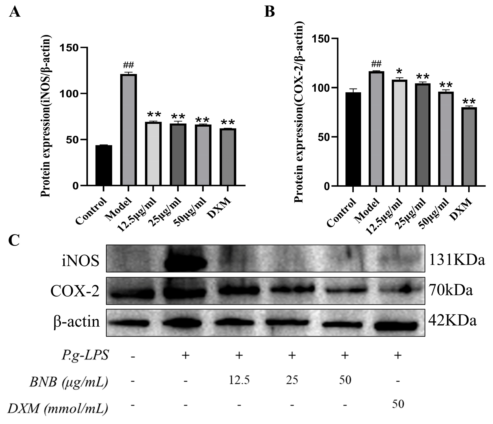 3.7. BNB Reduces the Expression of Inflammatory Factors in LPS-Induced RAW264.7 Cell Inflammation