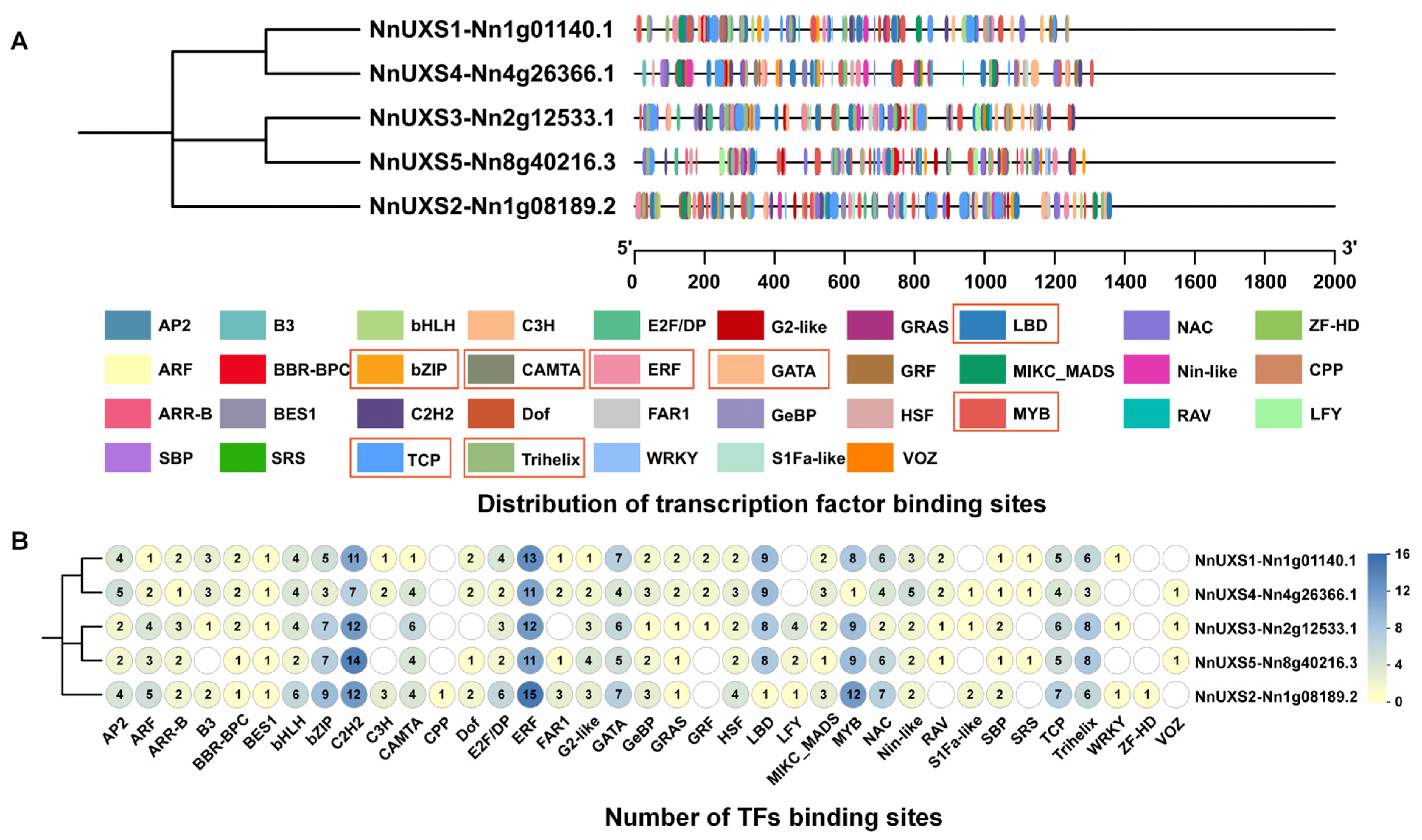 4.6. Transcription Factor Binding Sites Analysis and Cis-Acting Elements Prediction of NnUXSs Promoter