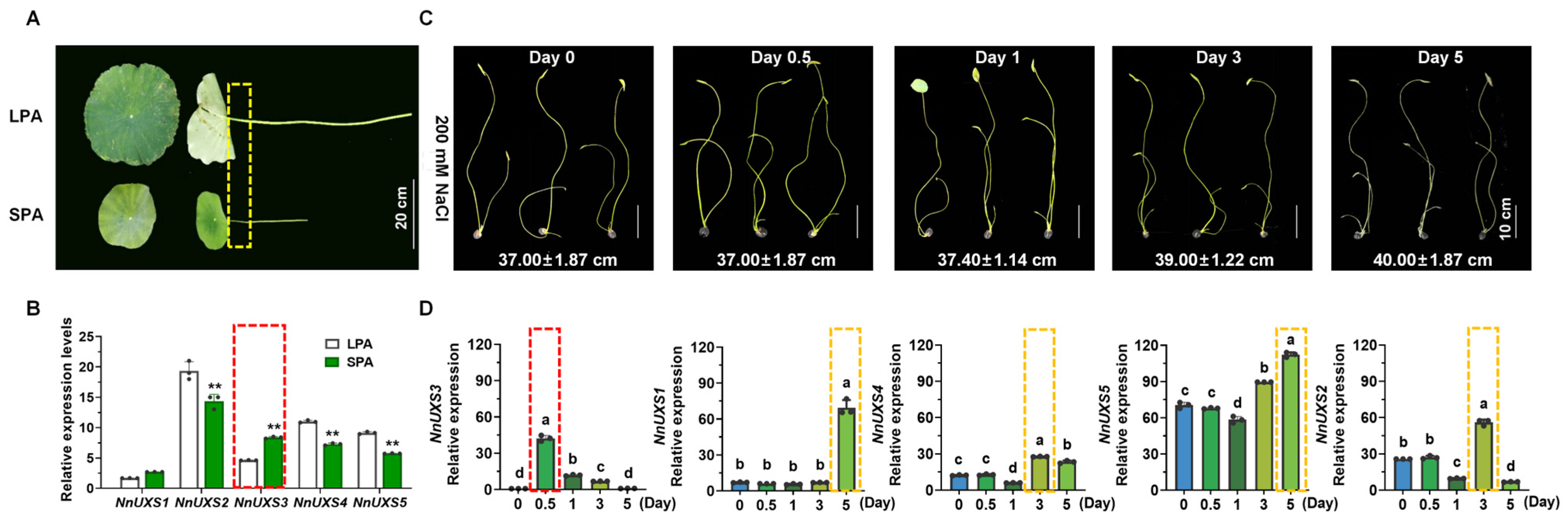 Wang, L.; Zheng, X.; Liu, Y.; Mao, Q.; Chen, Y.; Zhao, L.; Cheng, X.; Chen, L.; Hu, H. Genome-Wide Analysis of Nelumbo nucifera UXS Family Genes: Mediating Dwarfing and Aquatic Salinity Tolerance. Plants 2026, 15, 116. https://doi.org/10.3390/plants15010116