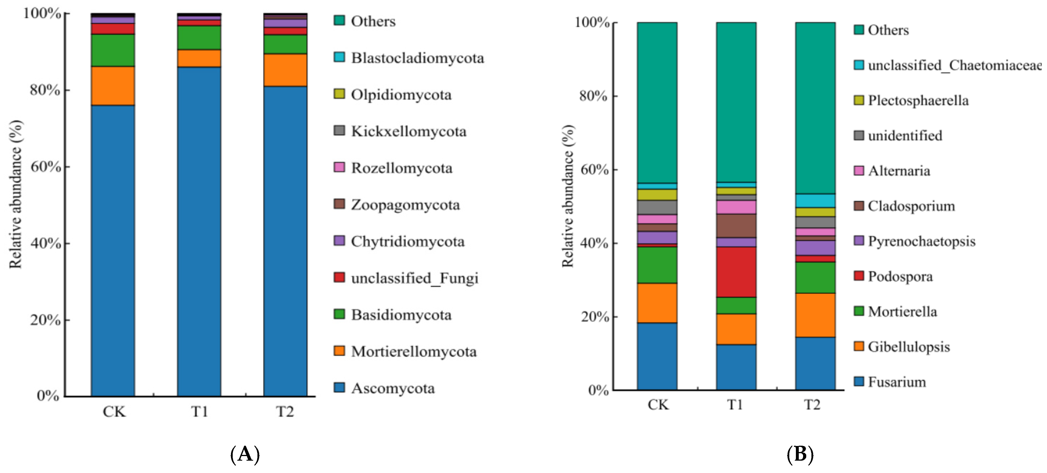 - Meng, P.P.; Liu, X.; Qiu, H.Z.; Zhang, W.R.; Zhang, C.H.; Wang, D.; Zhang, J.L.; Shen, Q.R. Fungal population structure and its biological effect in rhizosphere soil of continuously cropped potato. Chin. J. Appl. Ecol. 2022, 3, 3079–3086. [Google Scholar]