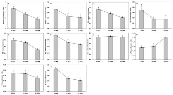 Figure 5. Unsaturation index of polar lipid molecular species in the developing cotyledon of perilla: (A) monogalactosyldiacylglycerol (MGDG); (B) digalactosyldiacylglycerol (DGDG); (C) phosphatidylcholine (PC); (D) lysophosphatidylcholine (LPC); (E) phosphatidylethanolamine (PE); (F) phosphatidylserine (PS); (G) phosphatidic acid (PA); (H) lysophosphatidic acid (LPA); (I) phosphatidylglycerol (PG); and (J) phosphatidylinositol (PI). DAA indicates days after anthesis. The data are presented as mean ± SD of three biological replicates. The bars followed by different letters are significantly different according to the LSD-test (p < 0.05).