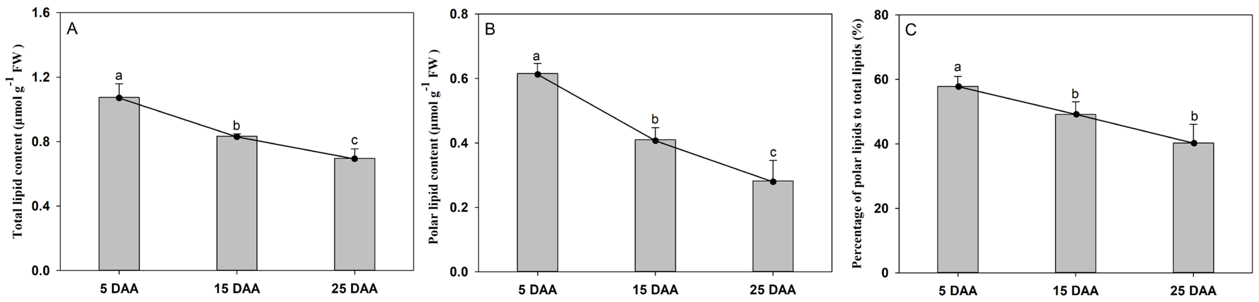 2.1. Changes in Total Lipid and Polar Lipid Contents During Cotyledon Development
