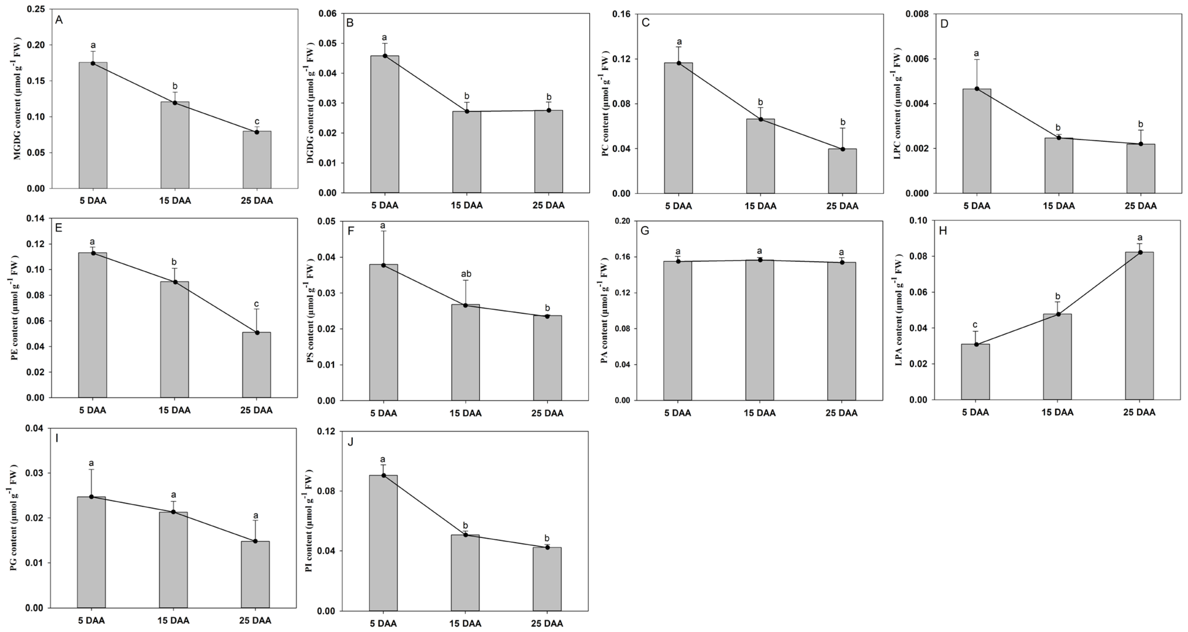 Figure 2. Polar lipid contents in the developing cotyledon of perilla: (A) MGDG; (B) DGDG; (C) PC; (D) LPC; (E) PE; (F) PS; (G) PA; (H) LPA; (I) PG; and (J) PI contents. MGDG, monogalactosyldiacylglycerol; DGDG, digalactosyldiacylglycerol; PC, phosphatidylcholine; LPC, lysophosphatidylcholine; PE, phosphatidylethanolamine; PS, phosphatidylserine; PA, phosphatidic acid; LPA, lysophosphatidic acid; PG, phosphatidylglycerol; PI, phosphatidylinositol. DAA indicates days after anthesis. The data are presented as mean ± SD of three biological replicates. The bars followed by different letters are significantly different according to the LSD-test (p < 0.05).