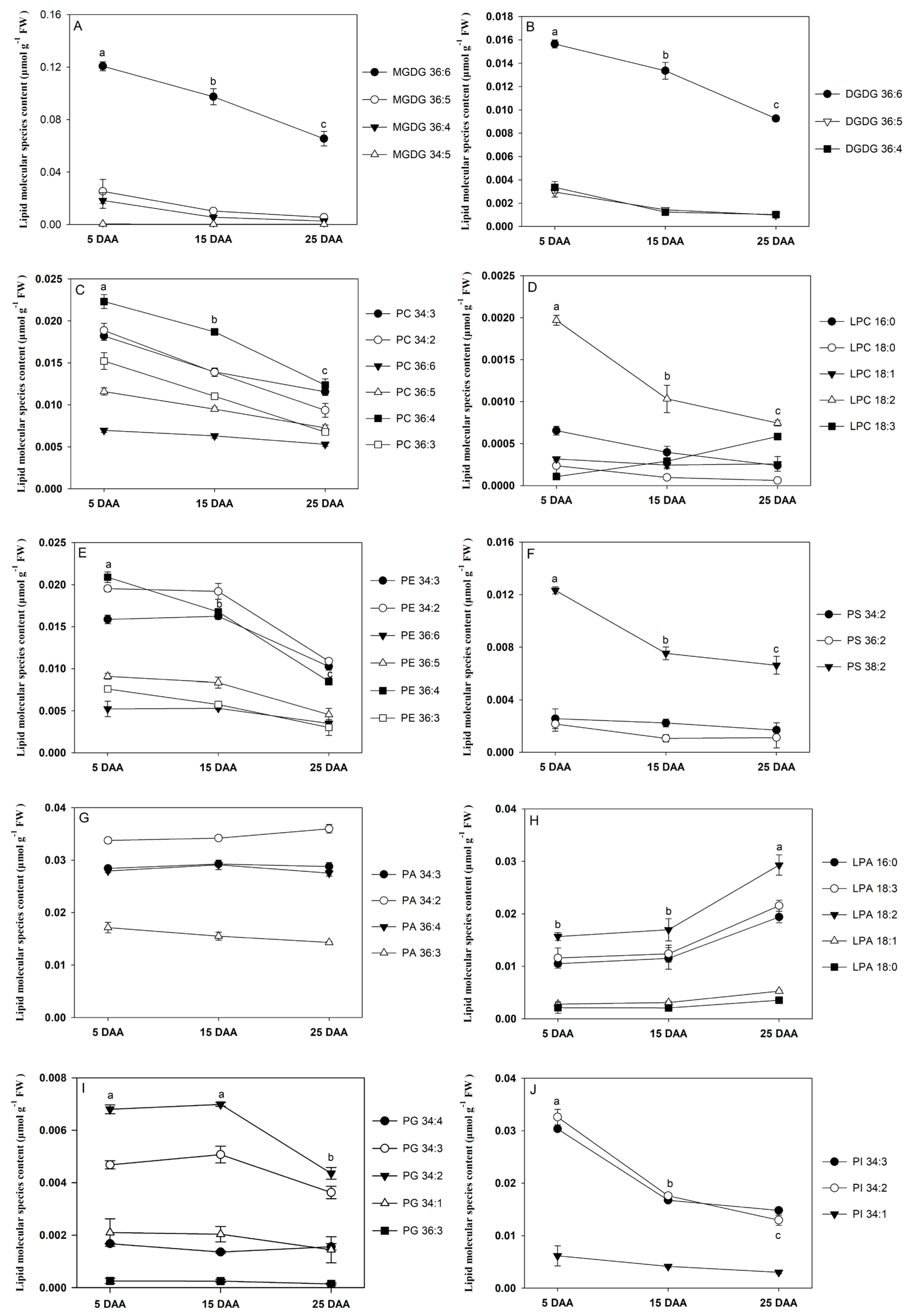 Figure 3. Major polar lipid molecular species in the developing cotyledon of perilla: (A) monogalactosyldiacylglycerol (MGDG); (B) digalactosyldiacylglycerol (DGDG); (C) phosphatidylcholine (PC); (D) lysophosphatidylcholine (LPC); (E) phosphatidylethanolamine (PE); (F) phosphatidylserine (PS); (G) phosphatidic acid (PA); (H) lysophosphatidic acid (LPA); (I) phosphatidylglycerol (PG); and (J) phosphatidylinositol (PI). DAA indicates days after anthesis. The data are presented as mean ± SD of three biological replicates. The bars followed by different letters are significantly different according to the LSD-test (p < 0.05).