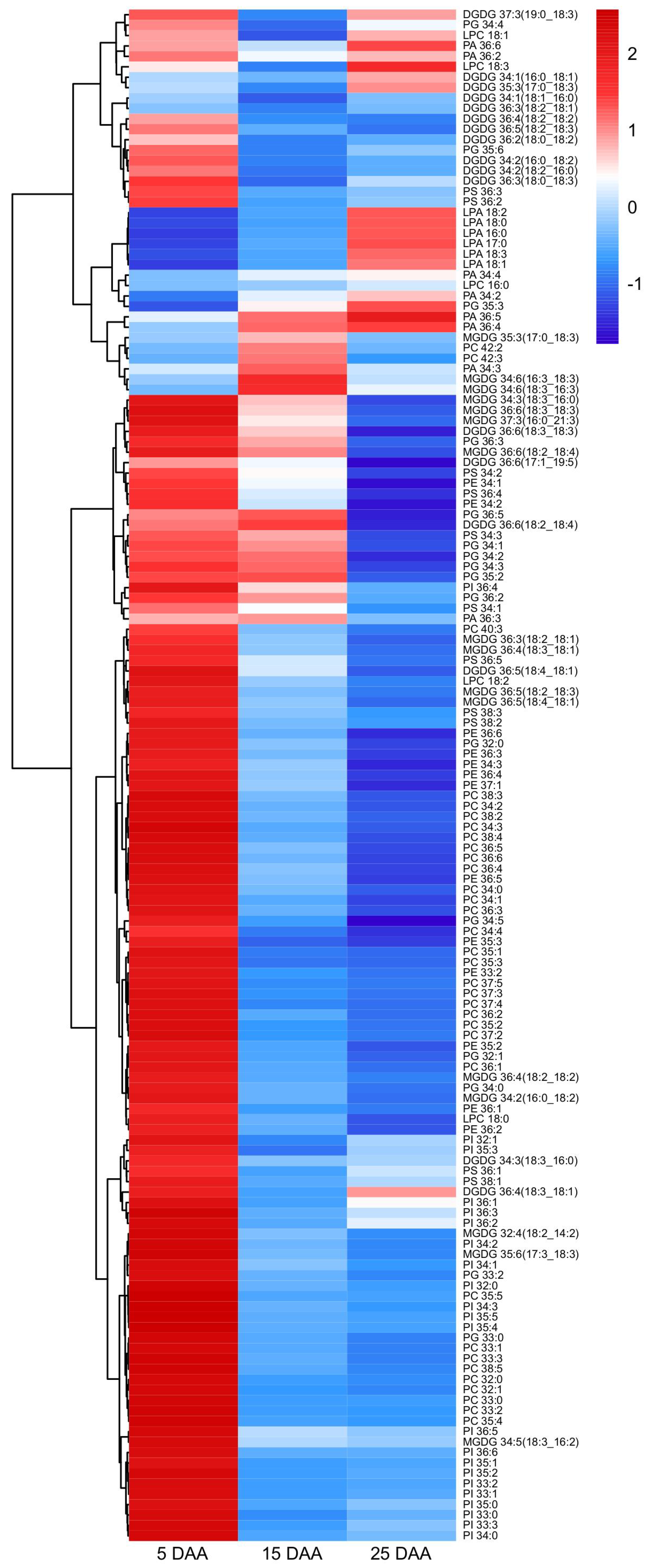Figure 4. Heatmap of the contents of lipid molecule species at three developmental stages in the cotyledon of perilla. Each row represents an individual lipid species, with abundance values normalized using Z-scores. Hierarchical clustering was performed based on the Euclidean distance measure and the Ward.D2 method for linkage analysis. DAA indicates days after anthesis.