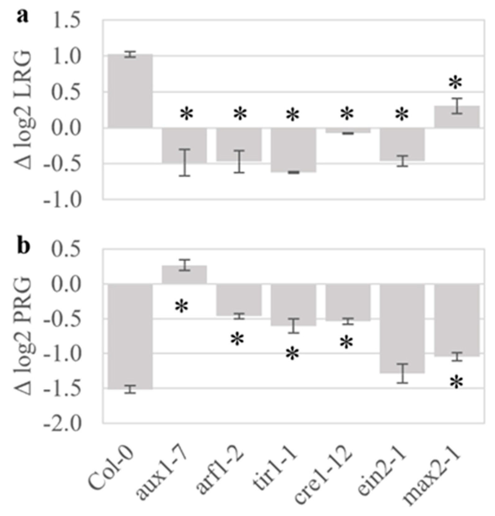 - Pickett, F.B.; Wilson, A.K.; Estelle, M. The AUX1 mutation of Arabidopsis confers both auxin and ethylene resistance. Plant Physiol. 1990, 94, 1462–1466. [Google Scholar] [CrossRef]