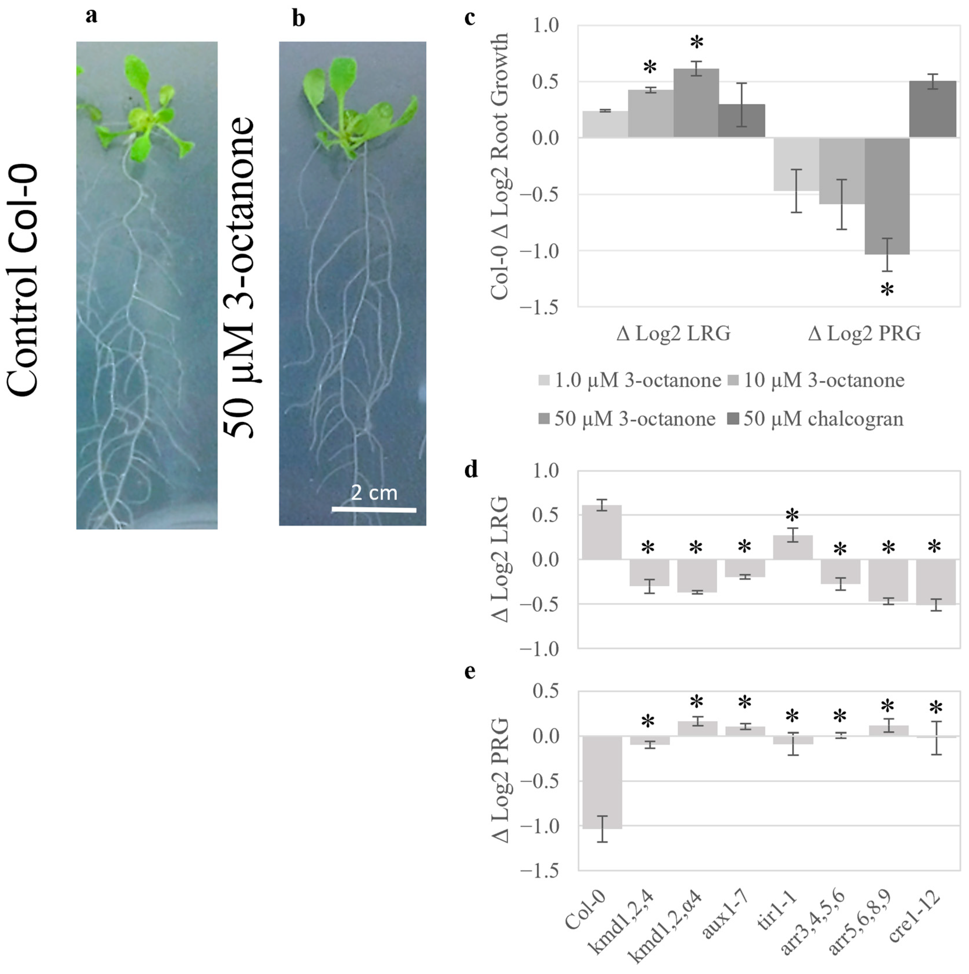 2.8. The Root Growth Response Elicited by the Bioactive Volatile 3-Octanone Depends on KMD and Auxin/Cytokinin Homeostasis
