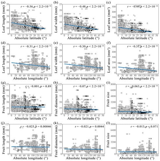 For the morphological traits of leaves and fruits in the n tropical Cryptocaryeae trees, the average values for leaf length, leaf width, leaf area, fruit length, fruit diameter, and fruit size are 13.15 mm, 5.64 mm, 51.03 mm2, 29.192 mm, 19.72 mm, and 557.40 mm2, respectively. The range of leaf length is 2.5–40 mm, the range of leaf width is 1.2–21 mm, the range of leaf area is 2.015–520.8 mm2, the range of fruit length is 6–120 mm, the range of fruit diameter is 4–100 mm, and the range of fruit size is 28.27–7068.6. Analysis using a general linear model revealed that leaf and fruit morphological traits in Cryptocaryeae species exhibit relationships with latitude and longitude. We further observed that the magnitude of response differed between the leaf and fruit morphological traits, the leaf morphological traits were influenced by spatial variation along latitudinal and longitudinal gradients (Figure 1). Leaf traits (including leaf length, leaf width, and leaf area) showed a significant negative correlation with latitude (Figure 1a–c, p < 0.001, r = −0.56, −0.48 and −0.49, respectively). This indicates that leaves at higher latitudes were significantly shorter, narrower, and smaller in area compared to those in tropical regions. Additionally, a significant negative trend was also observed for leaf traits along the longitudinal gradient (Figure 1d–f, p < 0.001, r = −0.31, −0.30 and −0.31, respectively), demonstrating pronounced spatial variability in leaf morphology. In contrast, fruit traits (fruit length, fruit diameter, and fruit size) exhibited no detectable pattern across both latitudinal and longitudinal gradients (Figure 1g–l; r = −0.001, −0.07, −0.063, −0.025, −0.021 and −0.013, respectively).