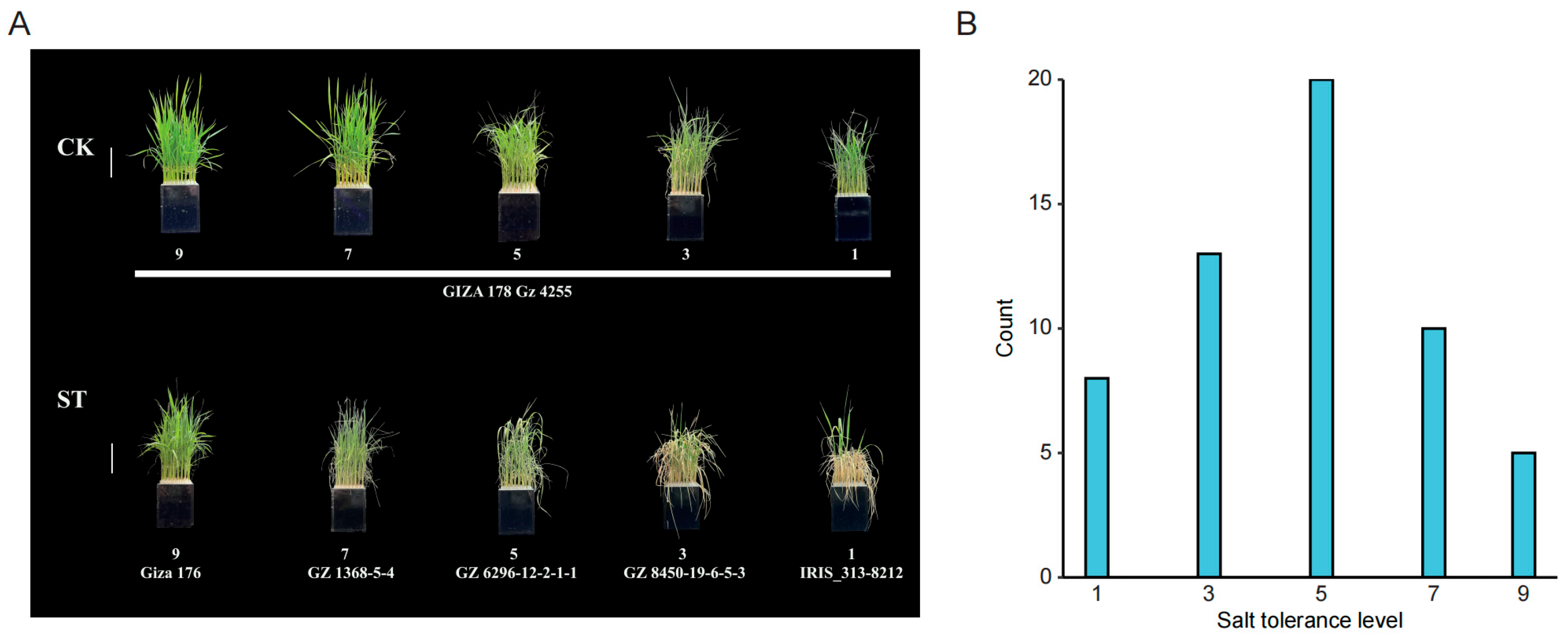- Wei, H.; Wang, X.; Zhang, Z.; Yang, L.; Zhang, Q.; Li, Y.; He, H.; Chen, D.; Zhang, B.; Zheng, C.; et al. Uncovering key salt-tolerant regulators through a combined eQTL and GWAS analysis using the super pan-genome in rice. Natl. Sci. Rev. 2024, 11, nwae043. [Google Scholar] [CrossRef] [PubMed]