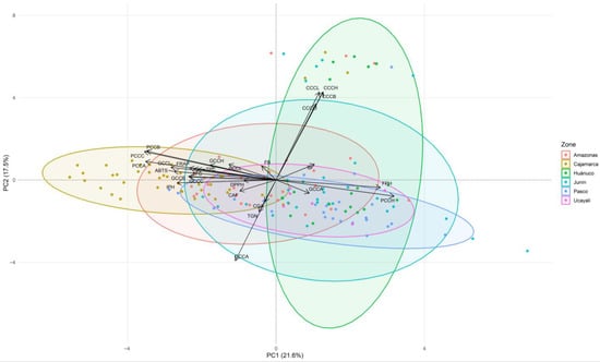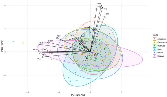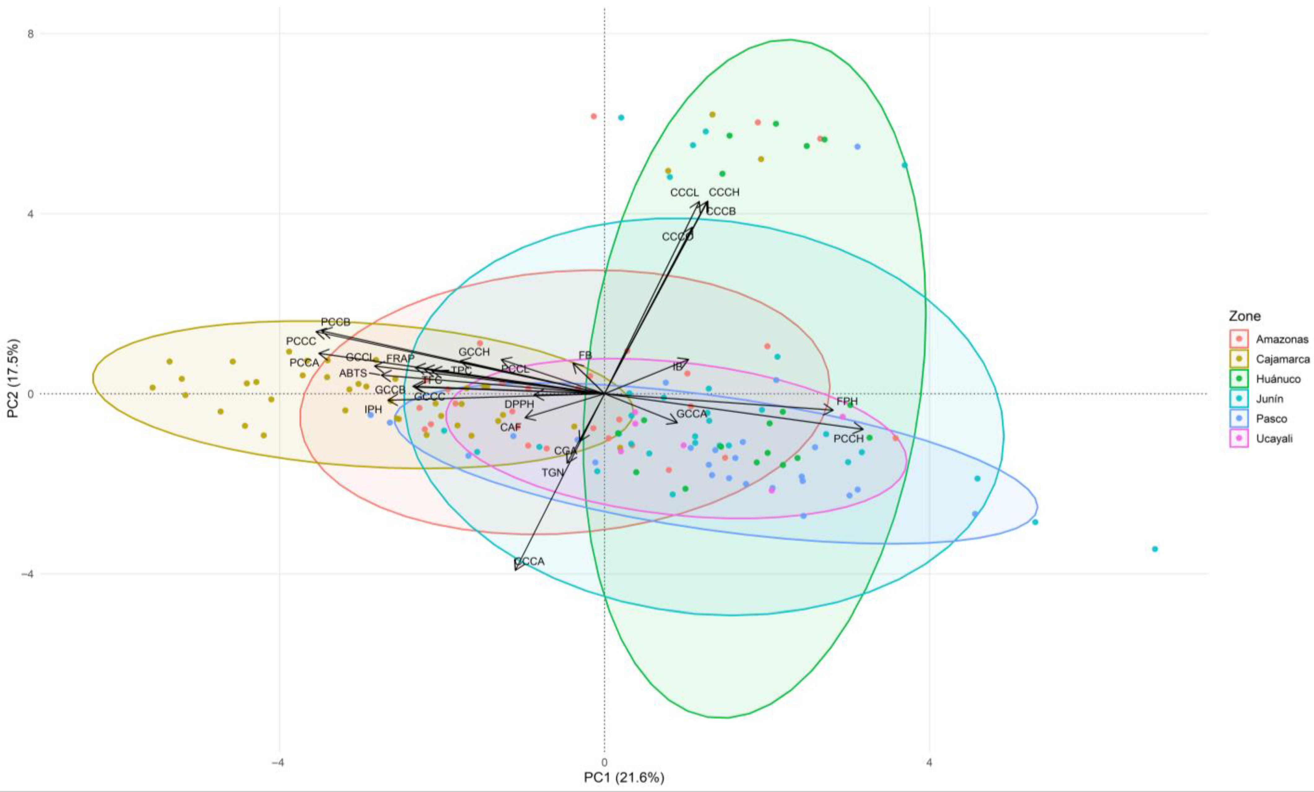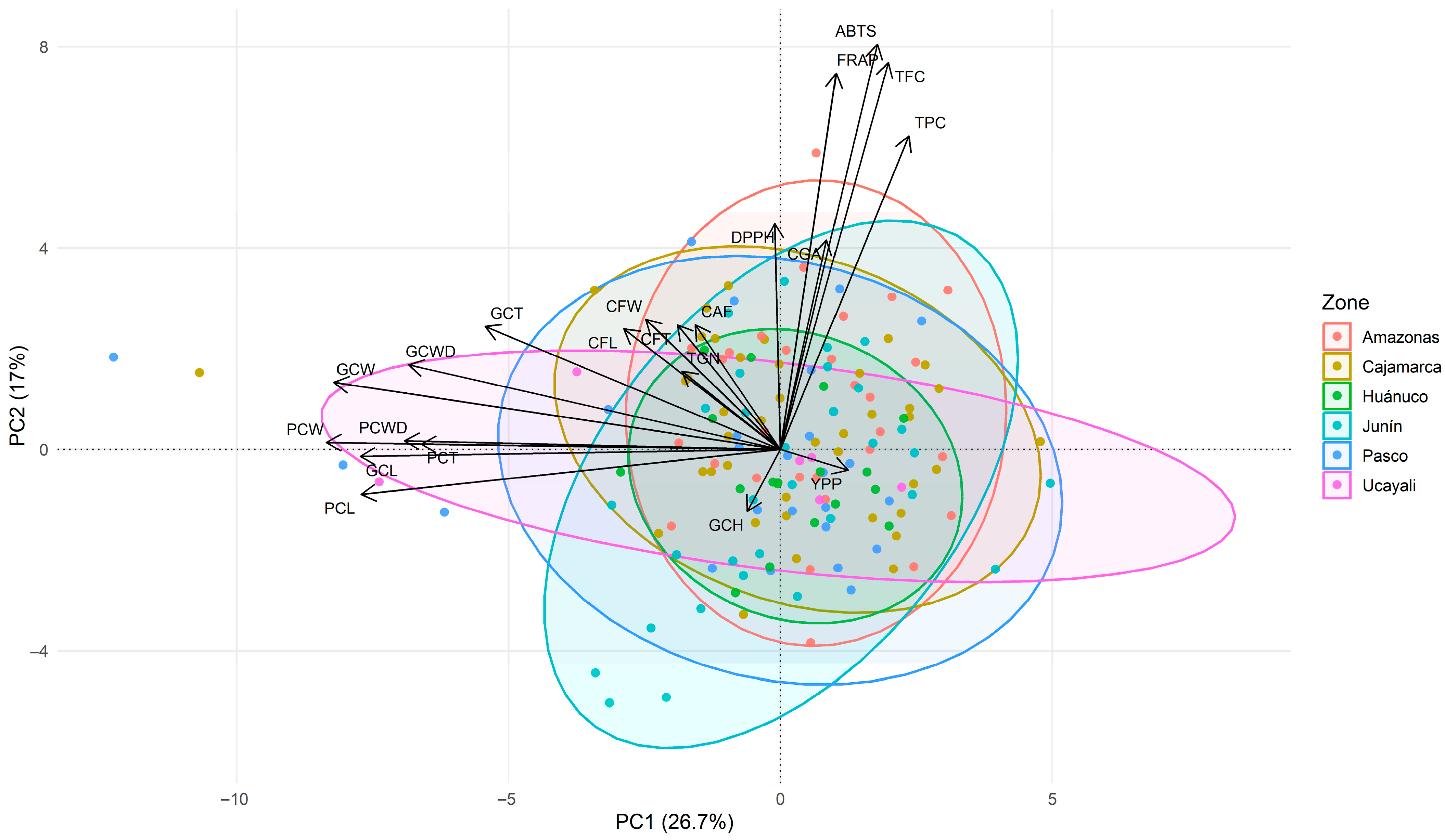 The accession cloud is dense around the origin, yet regional ellipses suggest subtle geographic tendencies: Huánuco shows higher PC2 scores (clear differences in cherry color), Pasco shifts toward positive PC1 (higher final pH/ in parchment coffee), and Cajamarca trends toward negative PC1 (greater color saturation aligned with higher phenolic/antioxidant content). Other regions largely overlap, indicating high intraregional heterogeneity. Taken together, this PCA indicates that postharvest color—particularly saturation in parchment and green beans—is associated with phenolic richness and antioxidant activity, whereas final pH and parchment hue angle () oppose this profile; cherry color adds an independent dimension that helps explain additional variance among accessions.