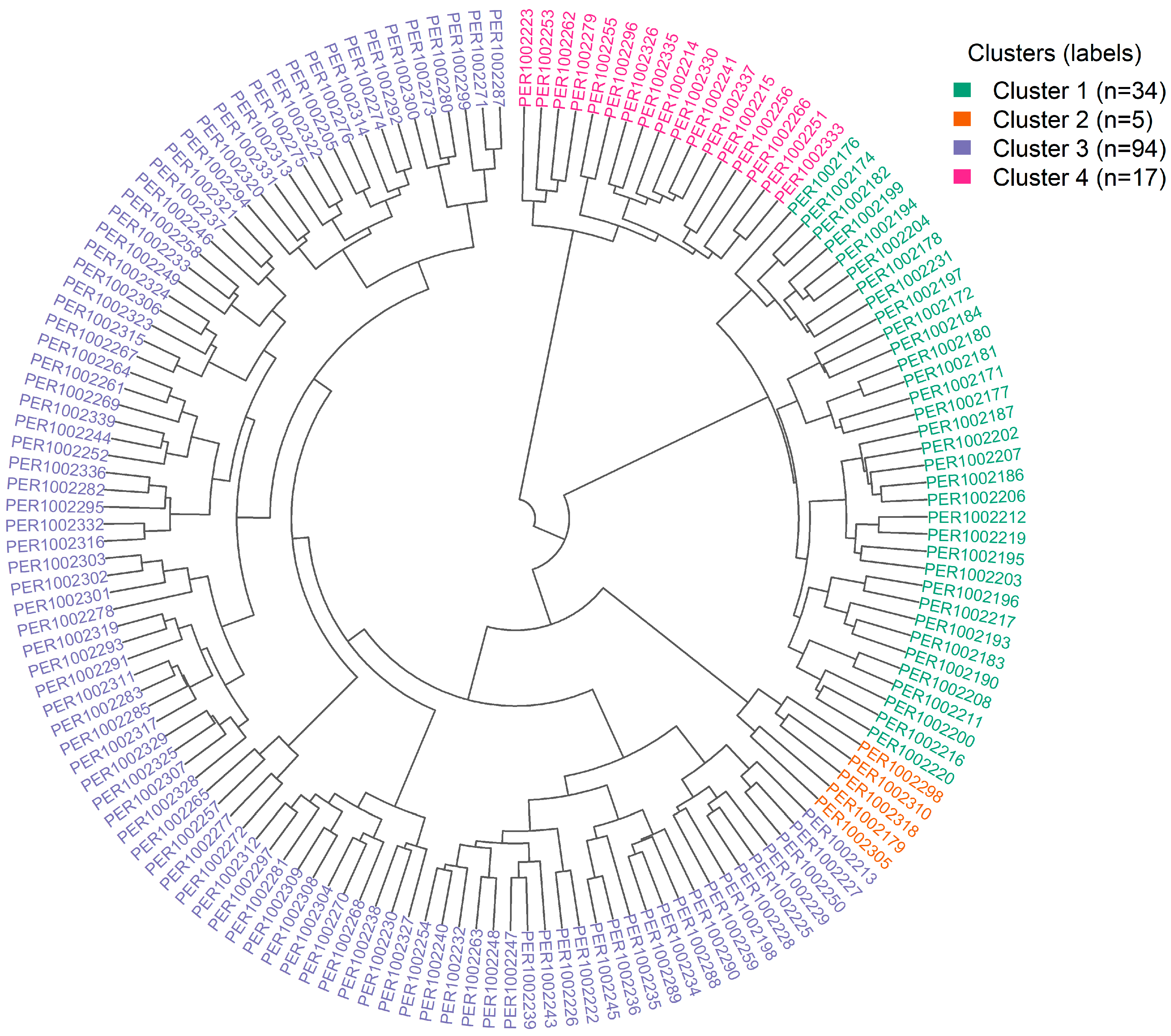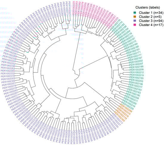 Table 2 summarizes the multivariate partition of the 150 accessions into four clusters and makes explicit, via accession codes (PER codes), each cluster’s distribution by region of origin. The partition is markedly uneven: Cluster 1 comprises 34 accessions (22.7% of the collection), Cluster 2 is a small, specialized set of 5 accessions (3.3%), Cluster 3 is the largest with 94 (62.7%), and Cluster 4 includes 17 accessions (11.3%).