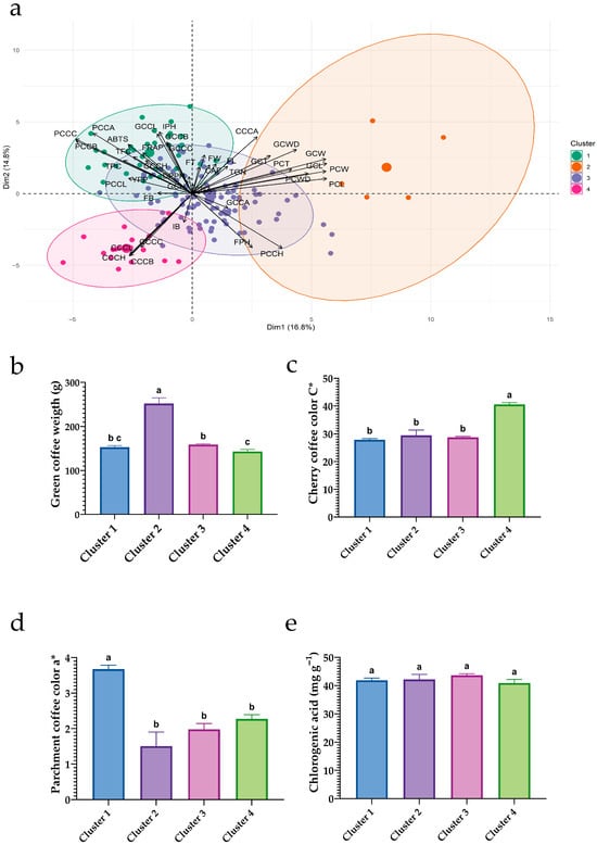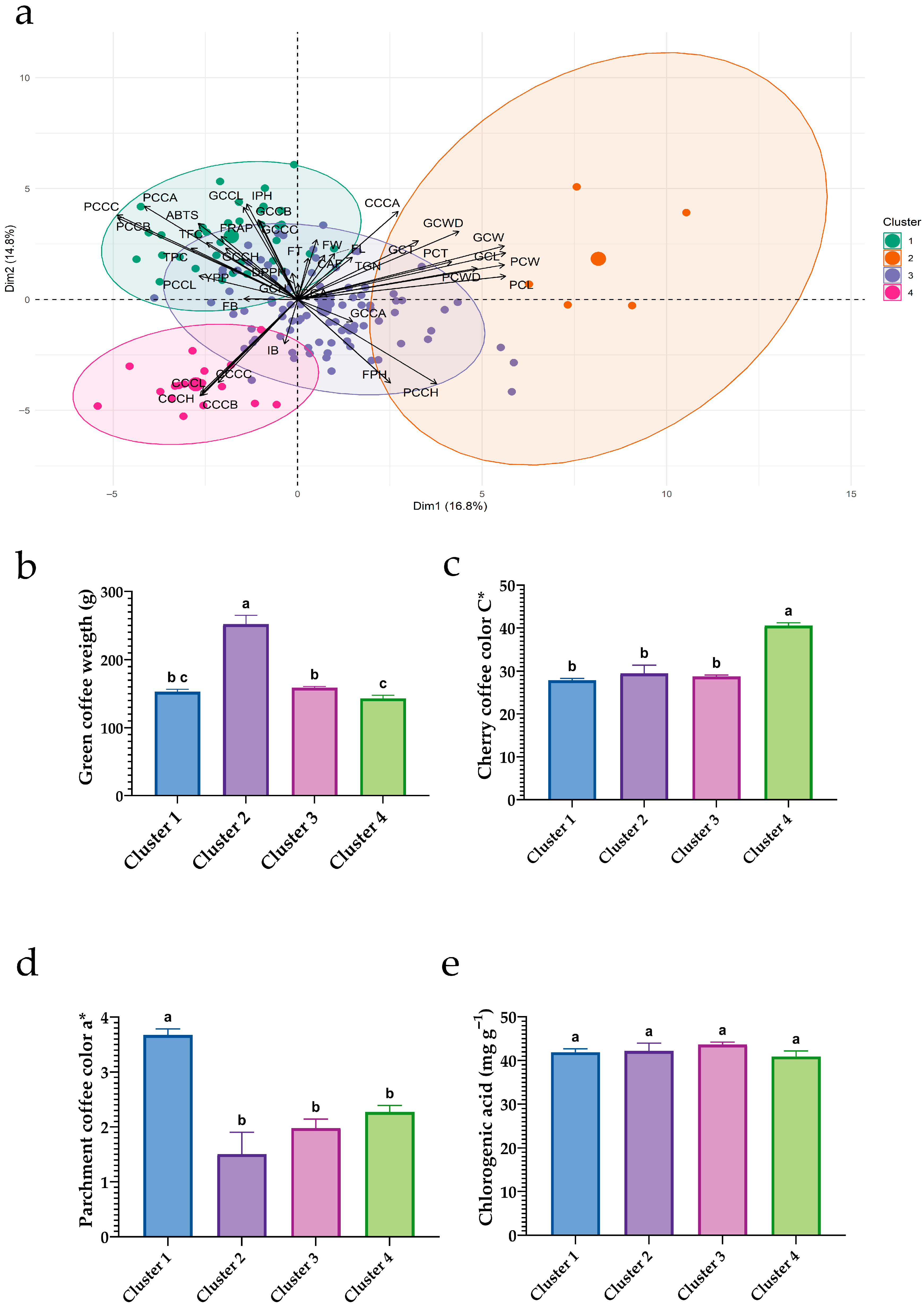 Figure 6. Multivariate clustering and contrasts of key traits among clusters in 150 coffee accessions. (a) PCA biplot constructed from morphological, color, fermentation, and bioactive variables; ellipses denote the four clusters obtained via hierarchical clustering (Ward–Euclidean). (b) Green bean weight by cluster; (c) cherry chroma (C*) by cluster; (d) parchment coffee red–green coordinate (a*) by cluster; (e) chlorogenic acid content (mg g−1) by cluster. Bar charts (be) show means ± SEM; different letters above bars indicate significant differences among clusters (Tukey HSD, p < 0.05).