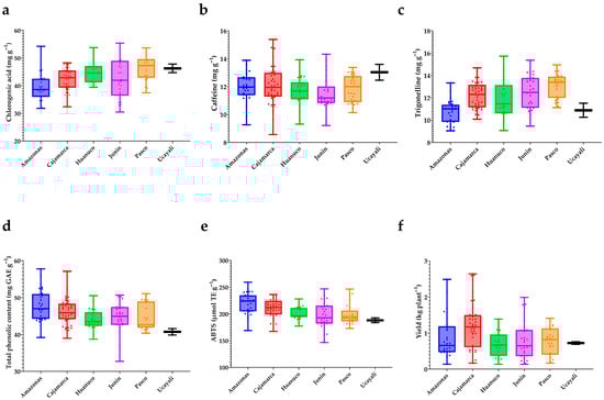 Figure 7. Variation in bioactive compounds, antioxidant activity, and yield among Peruvian Coffea arabica L. accessions by region of origin. (a) Chlorogenic acid (mg g−1); (b) caffeine (mg g−1); (c) trigonelline (mg g−1); (d) total phenolic content (mg GAE g−1); (e) antioxidant activity by ABTS (μmol TE g−1); (f) yield (kg plant−1). Boxplots display the full range with median lines; whiskers denote minimum and maximum values; points represent individual accessions.
