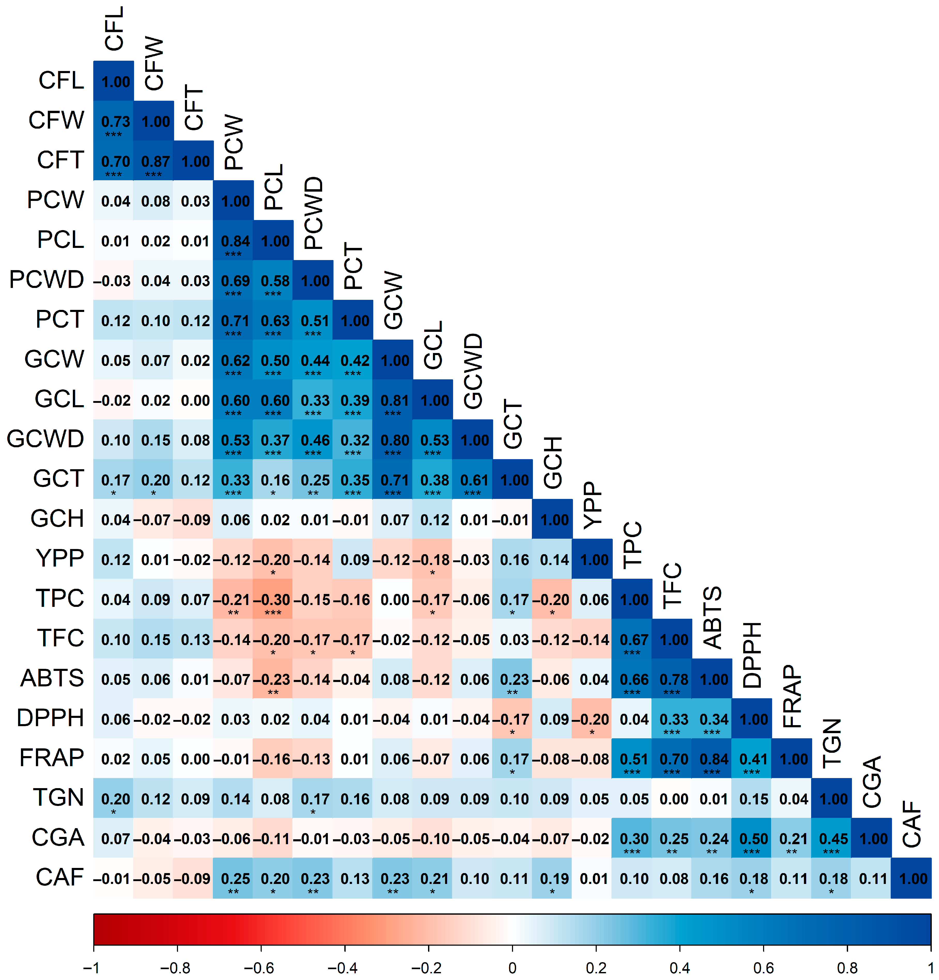 Figure 1. Spearman correlation matrix of pairwise associations among agro-morphological parameters, bioactive compounds, and antioxidant activity. Abbreviations: CFL, fruit length; CFW, fruit width; CFT, fruit thickness; PCW, parchment coffee weight; PCL, parchment coffee length; PCWD, parchment coffee width; PCT, parchment coffee thickness; GCW, green coffee weight; GCL, green coffee length; GCWD, green coffee width; GCT, green coffee thickness; GCH, green coffee moisture; YPP, yield per plant; TPC, total phenolic content; TFC, total flavonoid content; ABTS, DPPH, FRAP, antioxidant activity assays; TGN, trigonelline; CGA, chlorogenic acids; CAF, caffeine. Significance: p < 0.05 (*); p < 0.01 (**); p < 0.001 (***).