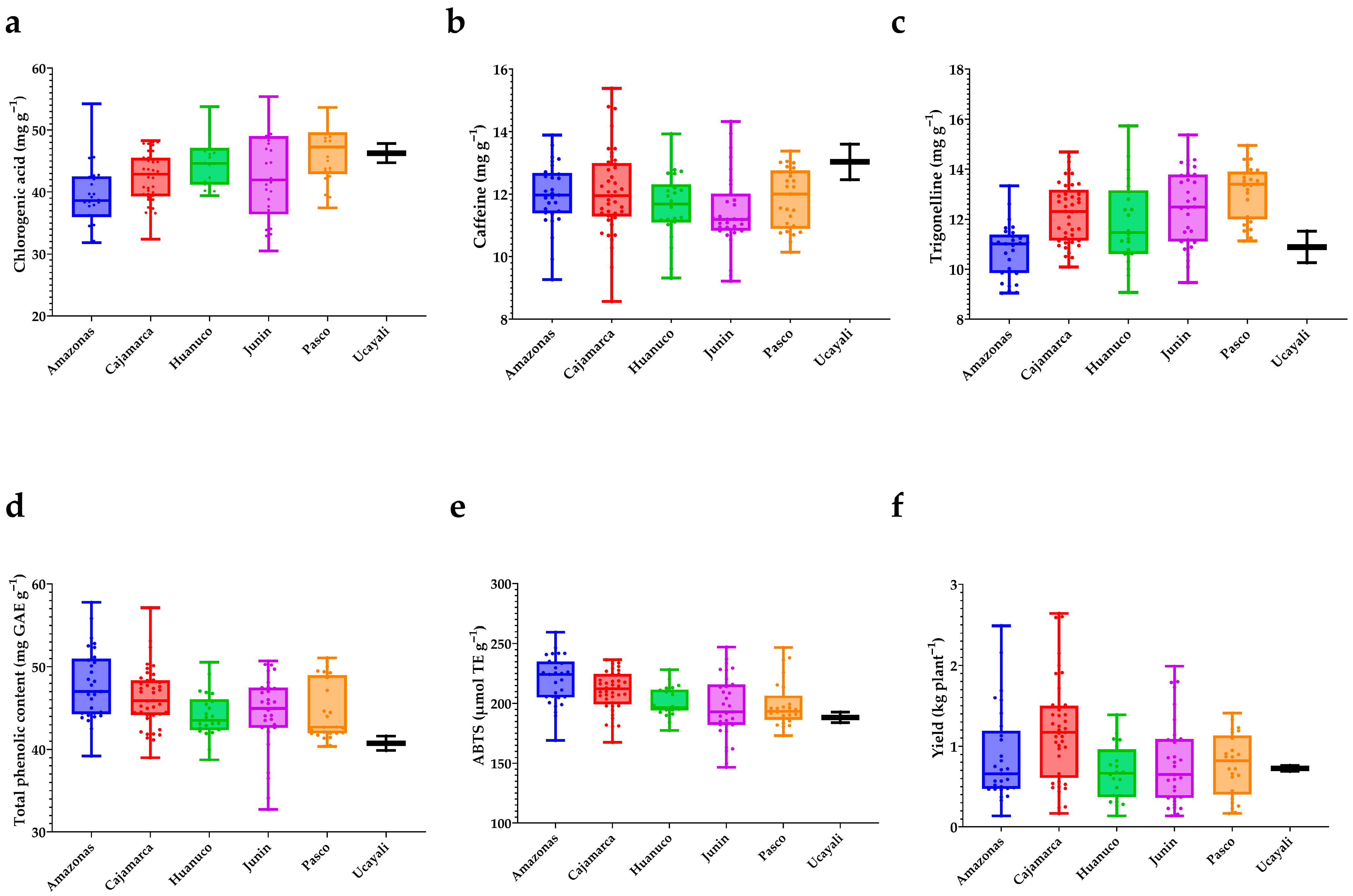 In Figure 7a–f summarize the distribution of key traits by geographic origin. For chlorogenic acids (a), medians are highest in Pasco and Ucayali, intermediate in Huánuco and Cajamarca, and lowest in Amazonas and Junín; dispersion is widest in Junín and narrowest in Ucayali, indicating both regional contrasts and substantial within-region variation. Caffeine (b) exhibits a different pattern: Cajamarca and Junín display the broadest spreads, whereas Amazonas, Pasco, Huánuco, and Ucayali occupy intermediate positions with overlapping interquartile ranges. For trigonelline (c), Junín and Pasco show higher medians, Cajamarca and Huánuco are intermediate, and Amazonas and Ucayali lie at the lower end.