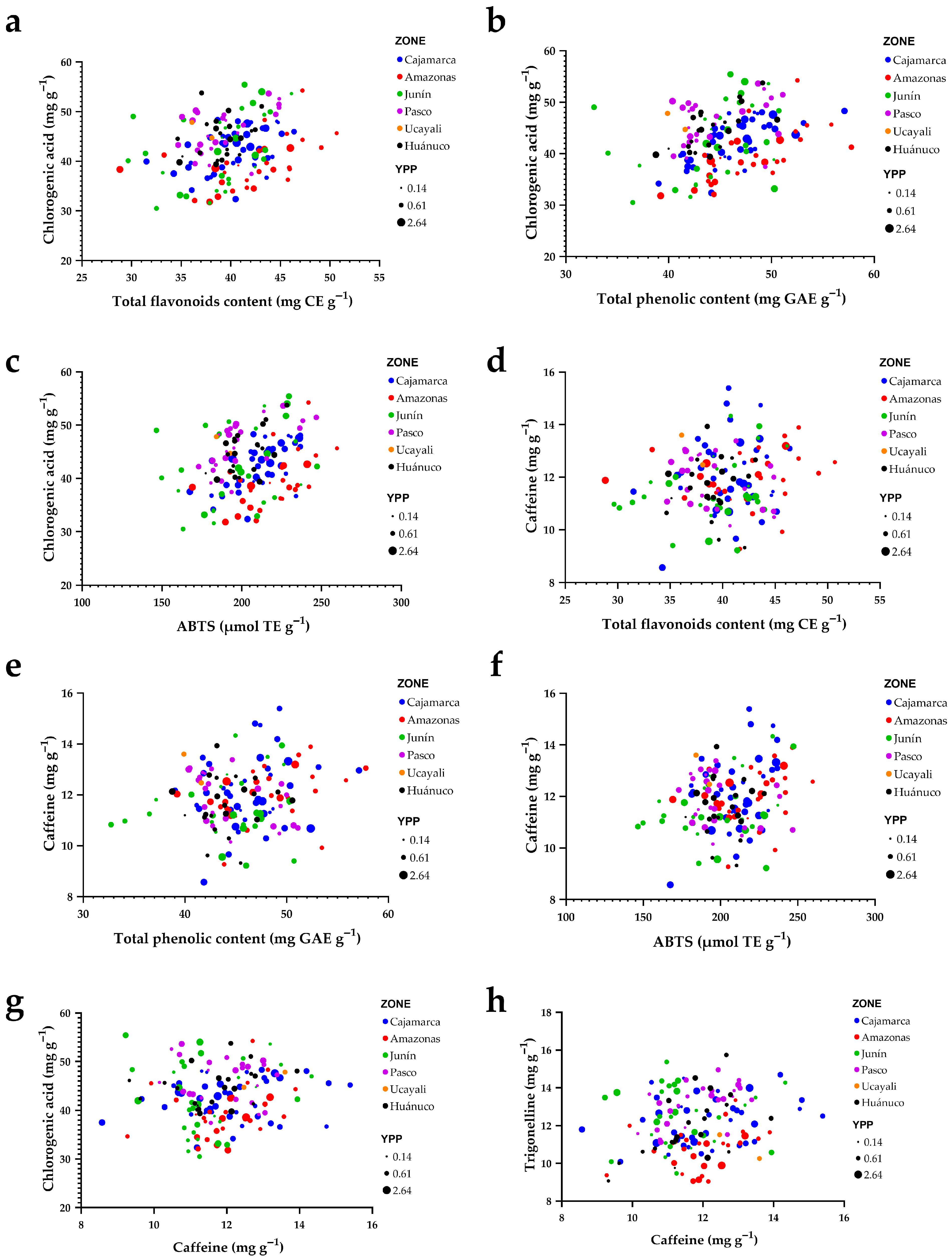 Figure 8. Bivariate relationships among bioactive compounds, antioxidant activity, and caffeine by region of origin. (a) Chlorogenic acids vs. total flavonoids; (b) chlorogenic acids vs. total phenolics; (c) chlorogenic acids vs. ABTS antioxidant activity; (d) caffeine vs. total flavonoids; (e) caffeine vs. total phenolics; (f) caffeine vs. ABTS antioxidant activity; (g) chlorogenic acids vs. caffeine; (h) trigonelline vs. caffeine. Points are colored by region and scaled by yield per plant (YPP).