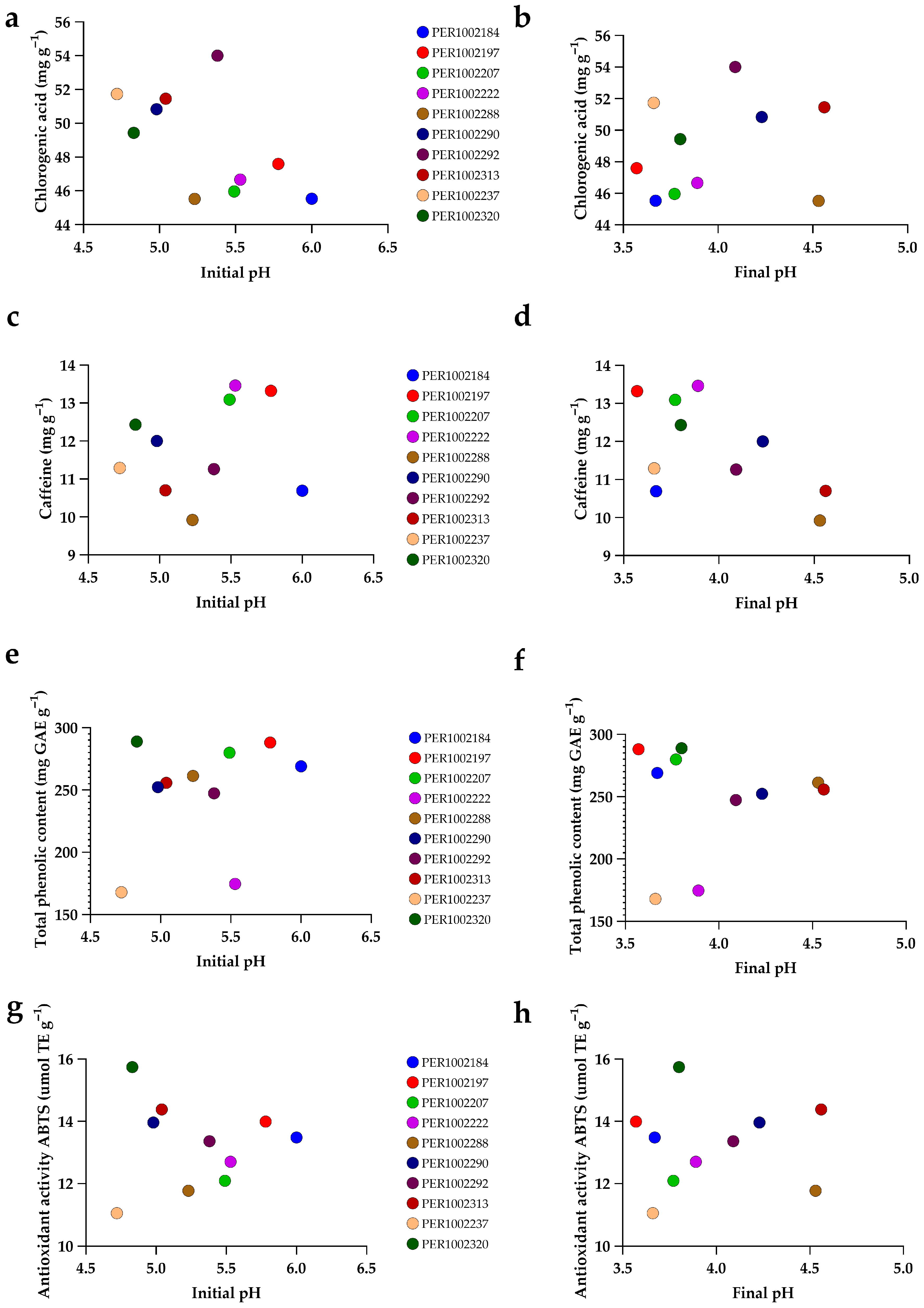Figure 9. Relationships between fermentation pH and bioactive/antioxidant traits in the top 10 selected coffee accessions. (a,b) Chlorogenic acids (mg g−1) vs. initial pH and final pH; (c,d) caffeine (mg g−1) vs. initial pH and final pH; (e,f) total phenolic content (mg GAE g−1) vs. initial pH and final pH; (g,h) ABTS antioxidant activity (μmol TE g−1) vs. initial pH and final pH. Each point represents an accession (IDs in the legend; colors are consistent across panels). pH was recorded at the beginning and at the end of fermentation for the same samples.