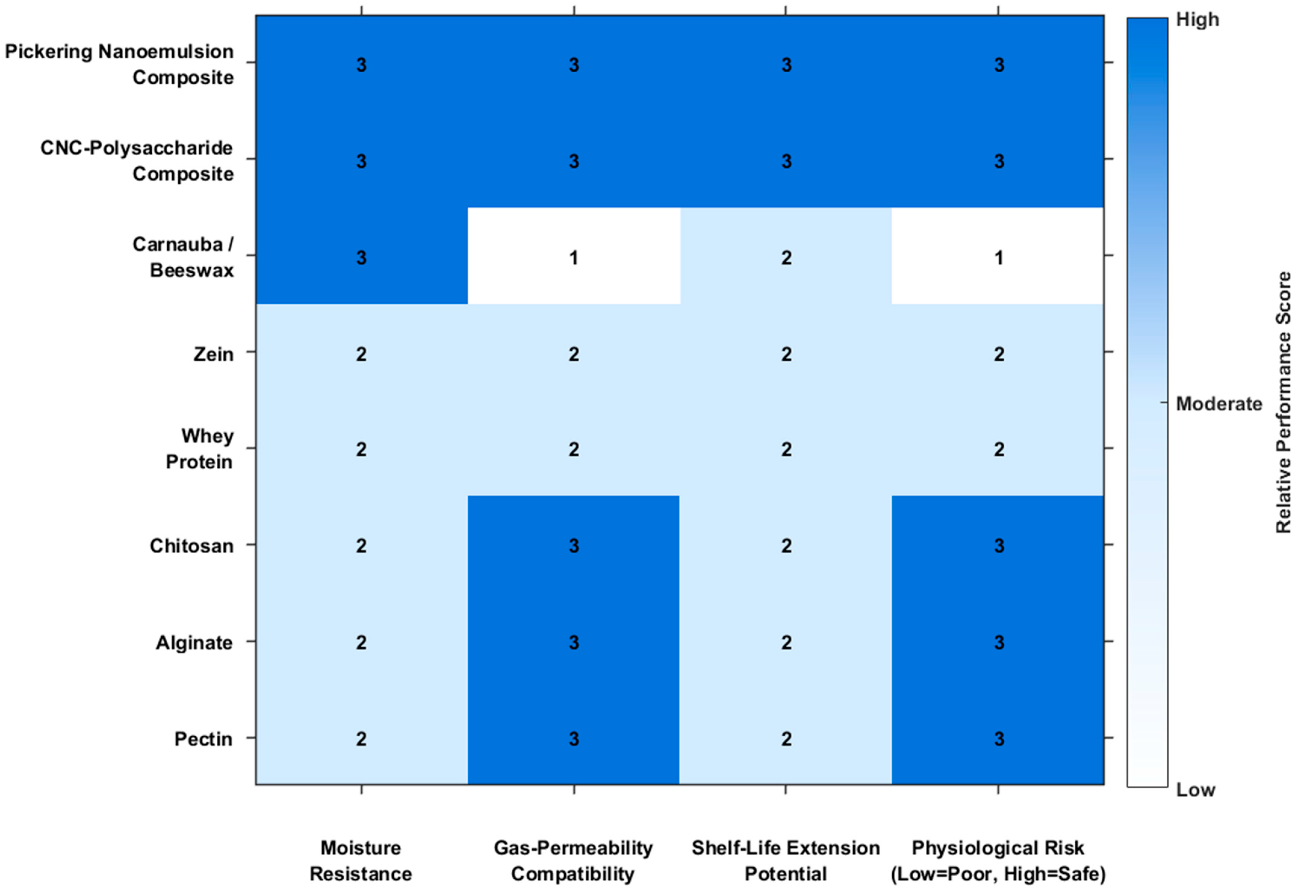 Single-component polysaccharide and protein coatings generally exhibit moderate moisture resistance and favorable gas-exchange compatibility, supporting low physiological risk but achieving only limited shelf-life extension unless formulation is optimized. In contrast, lipid-based coatings (e.g., carnauba/beeswax) score highly in moisture resistance but rank lower in gas-permeability compatibility and physiological safety, reflecting the documented tendency of dense wax layers to restrict O
