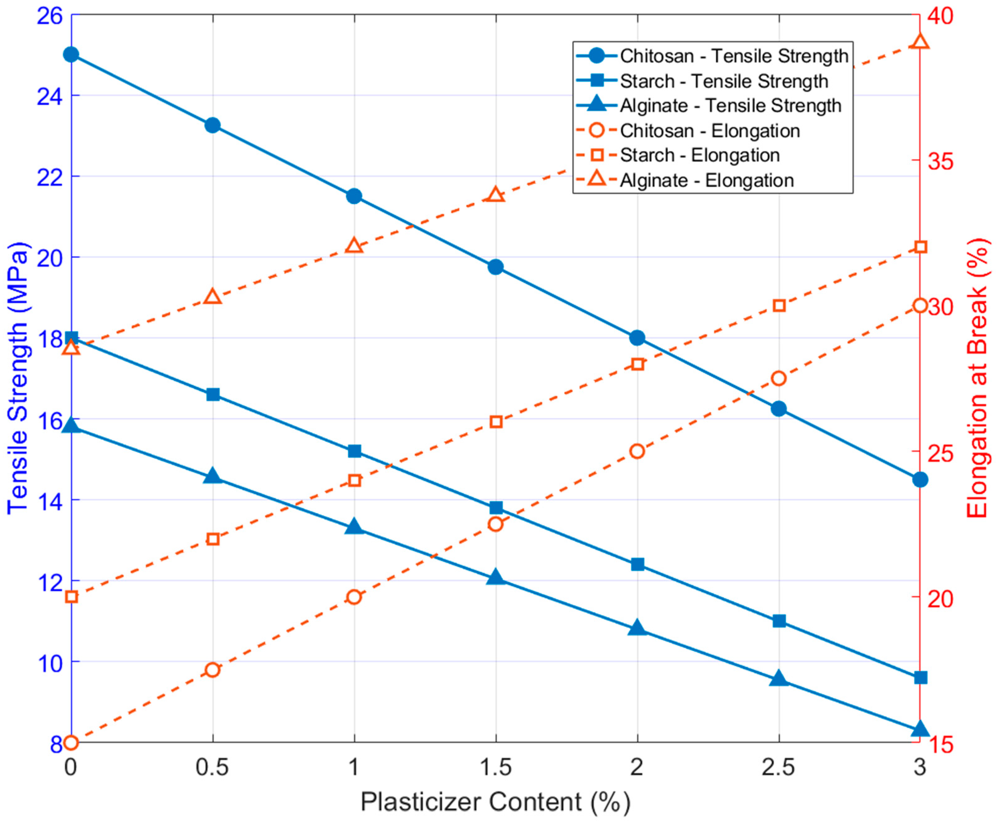 Figure 3 illustrates the mechanical trade-offs observed in chitosan-, CNC-reinforced-, and alginate-based edible coatings as plasticizer content increases. All systems show a consistent pattern: tensile strength declines while elongation at break rises. CNC-reinforced films retain higher tensile strength at comparable plasticizer levels, highlighting the structural benefits of nanocrystal incorporation. These trends, drawn from studies using ASTM D882 protocols [