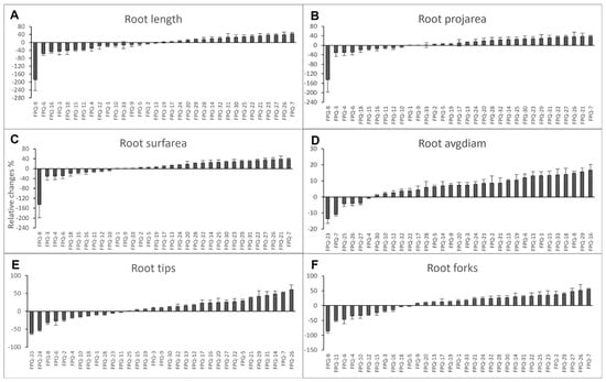 The relative changes in root length (A), project area (projarea) (B), surface area (surfarea) (C), average diameter (avgdiam) (D), tips (E) and forks (F) in 33 barley genotypes after one week of hypoxic stress. The relative changes were calculated by (control-waterlogging)/control × 100%. Data are the mean ± SE.
