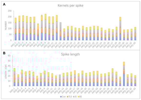 The spike length (A) and kernels per spike (B) in 33 barley genotypes under control (Con), three-leaf stage (TLS) waterlogging, jointing stage (JS) waterlogging and booting stage (BS) waterlogging treatment. Data are the mean ± SE.