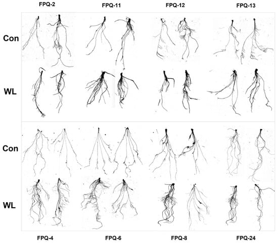 The image of roots in 8 barley genotypes under control (Con) and waterlogging (WL) condition. The top panel image represents the waterlogging-sensitive genotypes while the bottom panel image represents the waterlogging-tolerant genotypes.