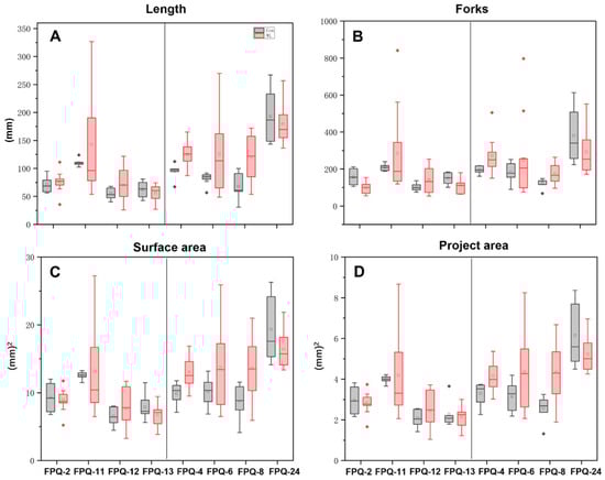 Box plot of root length (A), root forks (B), root surface area (C), root project area (D), in 8 barley genotypes after hypoxia treatment. Square represents mean value; line in the box indicates median value; bars represent the first and third quartile. Red and gray rhombuses mark outliers. In each four panels, the left part represents the waterlogging-sensitive genotypes while the right part represents the waterlogging-tolerant genotypes.