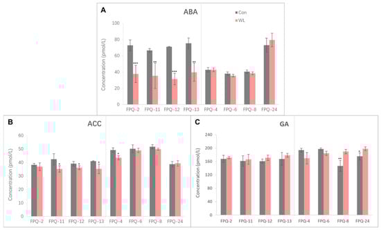 The abscisic acid (ABA) (A), ethylene precursor (ACC) (B), gibberellin (GA) (C) contents in eight genotypes’ roots. The gray bars represent control (Con), and the red bars represent waterlogging (WL) treatment. The significance levels are * p < 0.05, ** p < 0.01, and *** p < 0.001. In each panel, the left part represents the waterlogging-sensitive genotypes while the right part represents the waterlogging-tolerant genotypes.