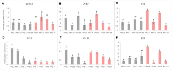 The relative gene expressions inlcuding (A) TCP20, (B) PLT2, (C) SHR, (D) SHY2, (E) PILS2 and (F) SCR in eight barley genotypes’ roots. Different lowercase letters represent significant differences between different varieties at p < 0.05. Gray bars represent waterlogging-sensitive genotypes and red bars represent waterlogging-tolerant genotypes.
