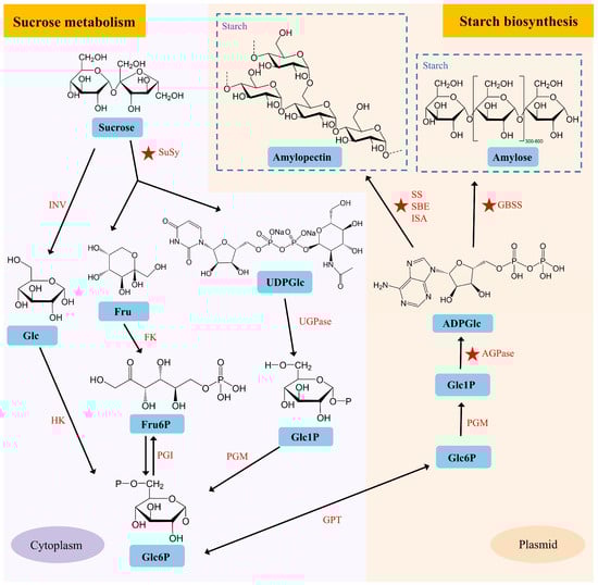 Lotus seed starch (LSS) is a natural high-amylose starch that exhibits unique physicochemical properties, such as a high gelatinization temperature and rapid retrogradation. It has potential applications in the development of foods with low glycemic indexes, prebiotics, and functional films, with broad uses in food processing, healthcare, and the materials industry [20,21]. The cotyledons of lotus seeds primarily accumulate starch, which accounts for approximately 40–60% of the dry biomass. The starch biosynthesis process is crucial during lotus seed development. Starch biosynthesis in developing seeds usually begins with sucrose metabolism [22]. Sucrose is converted into glucose-related substrates via two distinct metabolic pathways, yielding the key intermediate glucose-6-phosphate (Glc6P). Glc6P is subsequently transported into plastids and further converted to ADP-glucose (ADPGlc), which serves as the direct donor substrate for starch polymerization (Figure 2).