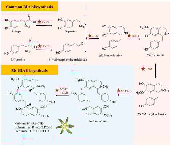 Predicted biosynthetic pathway of bis-BIAs in lotus plumule. TYDC, Tyrosine Decarboxylase; NCS, Norcoclaurine Synthase; 6OMT, Norcoclaurine 6-O-Methyltransferase; CNMT, Coclaurine N-Methyltransferase; CYP80A, (S)-N-methylcoclaurine 3′-hydroxylase; 7OMT, 7-O-Methyltransferase; 4′OMT, 4′-O-Methyltransferase. The ★ symbol indicates reported functional genes.