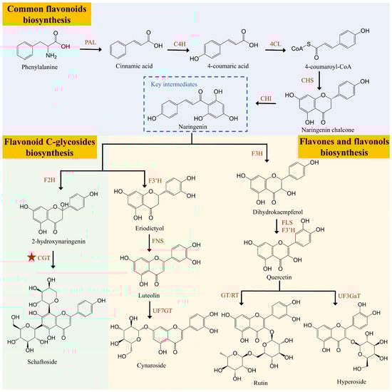 Predicted biosynthetic pathway of flavonoid in lotus plumule. PAL, Phenylalanine Ammonia Lyase; C4H, Cinnamate 4-Hydroxylase; 4CL, 4-Coumaryol CoA Ligase; CHS, Chalcone Synthase; CHI, Chalcone Isomerise; F3H, Flavanone 3-Hydroxylase; FLS, Flavonol Synthase; F3′H, Flavonoid 3′-Hydroxylase; UF3GaT, UDP-galactose: flavonoid 3-O-galactosyltransferase; GT, Glucosyltransferase; RT, Rhamnosyltransferase; F2H, Flavanone 2-Hydroxylase; CGT, Cyclodextrin Glycosyltransferase; FNS, Flavone Synthase; UF7GT, UDP-glucose: flavanone 7-O-glucosyltransferase. The ★ symbol indicates reported functional genes.